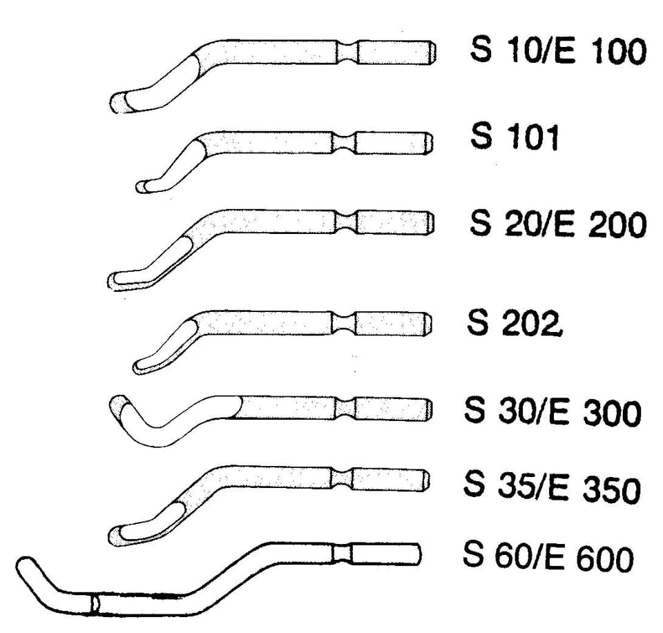 Z wymiennym dużym nożem ze stali szybkotnącej, do okrawania krawędzi różnych typów. Nóż zamocowany jest w oprawce obrotowo i samoczynnie dostosowuje się do kształtu obrabianej krawędzi. Do rur, otworów, krawędzi prostych itp.