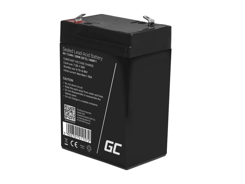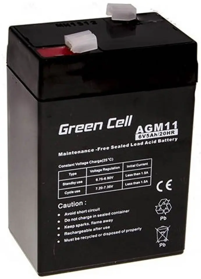 Pojemność: 5Ah Napięcie: 6V Typ: VRLA AGM Kolor: Czarny Terminal: Faston 187 (F1) Żywotność: ponad 5 lat Max. prąd rozładowania: 3C Samorozładowanie: 2% w ciągu miesiąca (przy temp. 25°C) Pojemność wg. temperatury: (40 °C - 102%) (25 °C - 100%) (0 °C - 85%) (-15 °C - 65%) Ładowanie buforowe: 6.75-6.90 V (-10 mV/C) Ładowanie cykliczne: 7.2-7.5 V (-15 mV/C) Rezystancja wewnętrzna: ≤23mΩ (przy temp. 25°C) Maksymalny prąd ładowania: 1.5 A Producent: Green Cell Wymiary: 70x47x101mm Waga: 0,78kg Wysokość całkowita (z konektorami): 107 mm Zastosowanie: do systemów alarmowych i zabawek Zakres pojemności: mniejsze niż 10Ah Gwarancja: 24 miesiące Kod produktu: AGM11