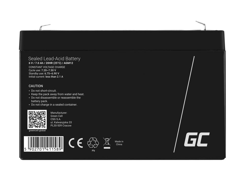 Pojemność: 7Ah Napięcie: 6V Typ: VRLA AGM Kolor: Czarny Terminal: Faston 187 (F1) Żywotność: ponad 5 lat Max. prąd rozładowania: 3C Samorozładowanie: 2% w ciągu miesiąca (przy temp. 25°C) Pojemność wg. temperatury: (40 °C - 102%) (25 °C - 100%) (0 °C - 85%) (-15 °C - 65%) Ładowanie buforowe: 6.75-6.90 V (-10 mV/C) Ładowanie cykliczne: 7.2-7.5 V (-15 mV/C) Rezystancja wewnętrzna: ≤18.5mΩ (przy temp. 25°C) Maksymalny prąd ładowania: 2.1 A Producent: Green Cell Wymiary: 151x35x94mm Waga: 1,02 kg Wysokość całkowita (z konektorami): 100 mm Zastosowanie: do systemów alarmowych i zabawek Zakres pojemności: mniejsze niż 10Ah Gwarancja: 24 miesiące Kod produktu: AGM12