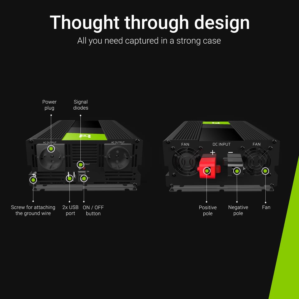- Uniwersalność - przetwornica Green Cell posiada nie tylko gniazda sieciowe, do których można podpiąć urządzenia elektryczne, ale także port USB do ładowania mniejszych gadżetów takich jak smartfon czy tablet