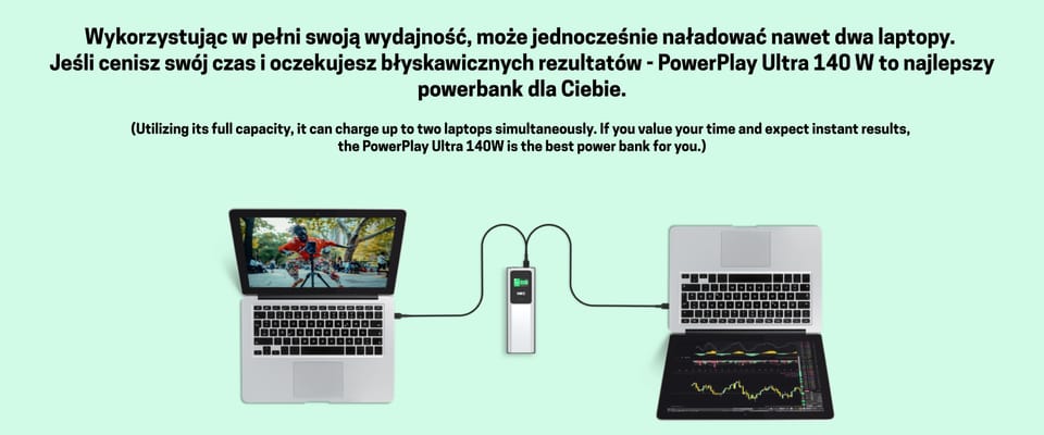 Description: Capacity: 25200mAhWarranty: 24 monthsThe possibility of return: Up to 30 daysProduct code: PBGC25UDManufacturer: Green CellWeight: 640gEfficiency: 93%Included: materiałowy futerał, kabel 140 W C-C 60cm, instrukcjaInput: USB-C1/USB-C2: 5V/3A9V/3A12V/3A 15V/3A 20V/5A 28V/5A 140 W max(PD3.1 QC3.0 AFC FCP)Output: USB-C1/USB-A1: 5V/3A9V/3A12V/3A 15V/3A 20V/5A 28V/5A 140 W max(PD3.1 QC3.0 AFC FCP) 4, 5V/5A5V/4, 5A5V/3A9V/3A 12V/1, 5A 18 W max(PD, QC, AFC, FCP, SCP)Fast charging Qualcomm Quick Charge 3.0: YesIncluded cable: Tak - przewód USB-C na USB-C 140 W o długości 60cmQuick charging technology: Green Cell Ultra ChargeTotal ports: 3 Compatibility list: Compatible with following battery models : Compatible with following devices :
