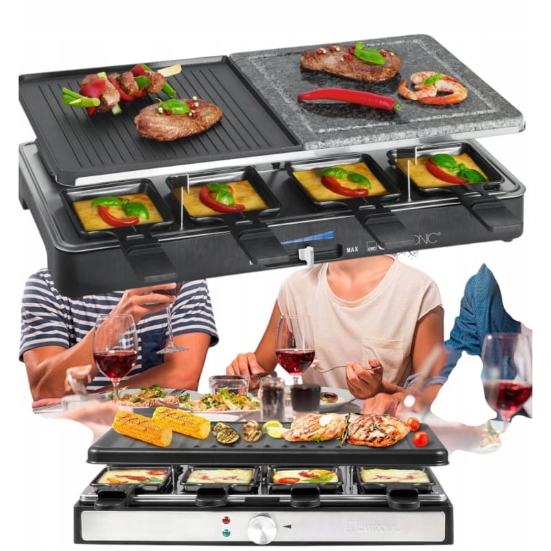 GRILL ELEKTRYCZNY RACLETTE XXL 1400W dla 8 osób dwustronna płyta szpatułkiNAJWYŻSZEJ JAKOŚCIELEKTRYCZNY GRILL RACLETTERENOMOWAJEN FIRMY CLATRONICMODEL: RG 3757Elektryczny grill typu raclette pozwoli ci cieszyć się grillowanymi i pieczonymi potrawami przez cały rok.Dwa poziomy grzania pozwalają na równoczesne grillowanie różnych potraw.Skorzystaj z 8 patelni, na których podasz potrawy w porcjach, np. szaszłyki, grillowane warzywa, jajecznicę lub risotto każdemu osobno.Łatwo ustawisz temperaturę za pomocą pokrętła - max do 1400 WDzięki mocy max 1400 W przypieczesz bardzo szybko warzywa, mięso lub kanapki z topionym serem. Grill szybko się nagrzewa i stabilnie podtrzymuje ciepło na obu poziomach. Temperaturę łatwo wyregulujesz korzystając z płynnie działającego termostatu.Konstrukcja grilla umożliwia grillowanie na dwóch poziomach: u dołu i u góry.Na dole oddzielisz od siebie grillowane produkty korzystając z 8 patelni. Możesz także przygotować potrawy w porcjach i podać je od razu do stołu, stawiając patelnie na odpornych, na temperaturę podstawkach.Górny poziom to gładka płaszczyzna idealna do wykorzystania przy większej ilości produktów lub dla biesiadników do wspólnego korzystania. Dzięki dwóm poziomom grzania grill nie zabiera dużo miejsca.Powierzchnia, którą masz do dyspozycji wynosi 42 x 21 cm. Wygodnie przyrządzisz potrawy ustawiając urządzenie na blacie.Dzięki temu, że powierzchnie pokryte są nieprzywierającą powłoką typu teflon, bardzo łatwo je wyczyścisz przecierając wilgotną szmatką, gdy jeszcze będą ciepłe.Czarna obudowa z dodatkami ze stali nierdzewnej pasuje do wystroju każdej kuchni.Najważniejsze cechy elektrycznego grilla raclette RG 3757:Nie nagrzewająca się obudowa Cool touchDo grillowania i opiekaniaMoc 1200–1400 WDemontowalna płyta grillowaNieprzywierająca powłoka na płytach grillowych i patelniach (łatwa do czyszczenia)8 patelni8 drewnianych szpatułekBezstopniowo regulowany termostat z pokrętłem ze stali nierdzewnejWskazanie „gotowości” temperatury2 lampki kontrolnePowierzchnia grilla: ok. 42 x 21 cmBezpieczna, stabilna podstawa dzięki gumowanym nóżkomZasilanie: 220–240 V, 50–60 HzSzybkie nagrzewanieDuża moc - od 1200 do 1400 WWszechstronnośćGrillowanie, zapiekanie oraz smażenieDuża powierzchniaCałkowita powierzchnia górnej części grilla to ok. 42 x 21 cmŁatwe czyszczenieGrill jest niezwykle łatwy w utrzymaniu czystości dzięki demontowalnym elementom i specjalnej powłoce zapobiegającej przywieraniu.Idealny na prezentUrządzenie posiada eleganckie opakowanie, dzięki czemu idealnie sprawdzi się, jako prezent!Wymiary grilla:Wymiary (ok. szer. x wys. x gł.) i wagaUrządzenie: 420 x 120 x 210 mm; 2.57 kgOpakowanie: 502 x 280 x 178 mm; 3.10 kg Produkt został odznaczony certyfikatem FOCUS - TEST DEUTSCHLANDS BESTECertyfikat TEST DEUTSCHLANDS BESTE został przyznany na podstawie badań przeprowadzonych przez „Germanys best household electronics”. W ramach testu porównane zostały produkty z ponad 20 000 marek z 274 segmentów rynkowych.Celem wyróżnienia „Focus” jest wskazywanie produktów cieszących się największym uznaniem konsumentów. Certyfikat przyznany jest na podstawie badań niemieckiego rynku i potwierdza wysoką jakość produktów a także świadczy o dużym zaufaniu konsumentów i renomie marki.slimtex