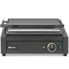 Kod producenta: 1030777Profesjonalny grill kontaktowy z płytą ryflowaną marki Hendi sprawdzi się idealnie do grillowania i podgrzewania chleba, kawałków mięsa, kiełbas, warzyw itp.. Obudowa wykonana została ze stali nierdzewnej, co gwarantuje wytrzymałość, a emaliowane żeliwne ruszty są łatwe w czyszczeniu i konserwacji. Za pomocą wbudowanego termostatu można płynnie regulować temperaturę do 300˚C. Tylne i boczne krawędzie przy dolnym grillu oraz wyjmowana taca ociekowa ułatwiają czyszczenie. Górną część grilla podnosi się za pomocą uchwytu odpornego na ciepło z możliwością zablokowania jej w dowolnym położeniu dzięki mechanizmowi sprężynowemu. Gumowe nóżki zmniejszają ryzyko niekontrolowanego przesuwania się urządzenia podczas użytkowania. Otwory wentylacyjne chronią grill przed przegrzaniem.Cechy produktu: