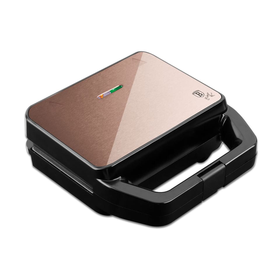 Elegancki i nowoczesny grill/opiekacz/gofrownica firmy Berlinger Haus z linii Rose Gold Collection. Urządzenie posiada 3 wymienne płytki. Idealnie będzie pasował do naczyń i akcesoriów kuchennych tej serii. Pozwoli przygotować bez dodatku tłuszczu steki, kiełbaski, warzywa lub ryby, a po zamianie płytek chrupiące tosty lub gofry.