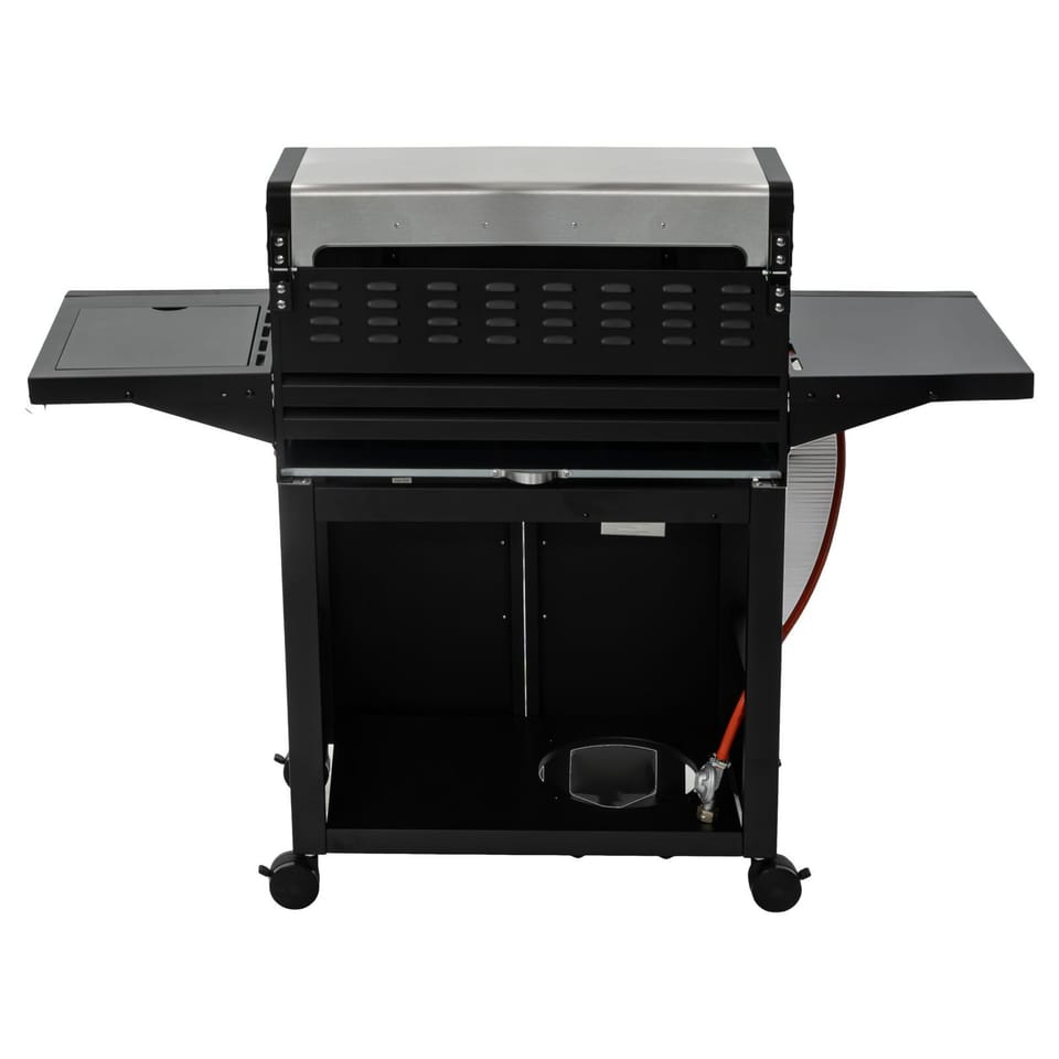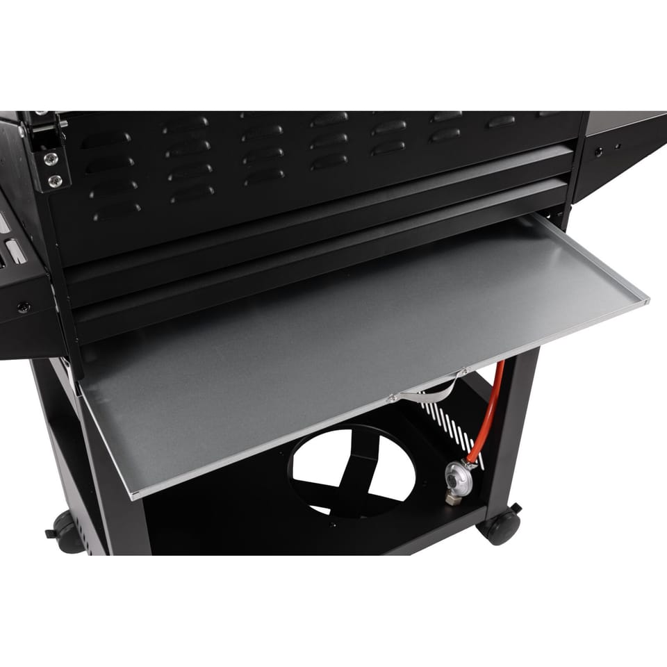 - Elektroniczny zapłon zintegrowany z pokrętłami, wbudowany termometr oraz stabilny wózek z kółkami i hamulcami sprawiają, że grill jest wygodny i bezpieczny w codziennym użytkowaniu