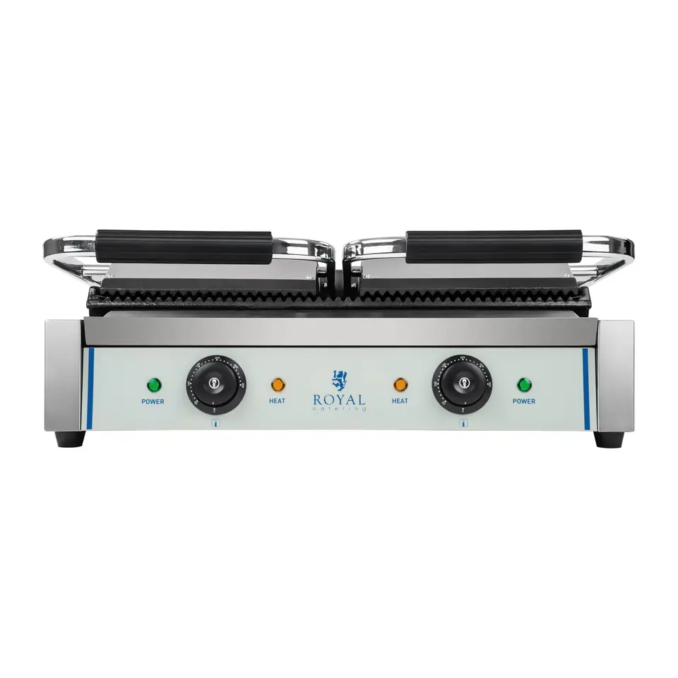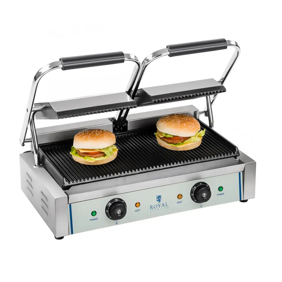 Nazwa producenta: RCKG-3600-GGrill kontaktowy podwójny przeznaczony jest do szybkiego przygotowywania dań mięsnych, warzywnych, kanapek, chleba panini. Dobrze sprawdzi się zarówno w profesjonalnych kuchniach, barach oraz gospodarstwach domowych. Idealne urządzenie do przygotowania STEKÓW.Płyty grzewcze wykonane zostały z żeliwa pokrytego emalią, która zapobiega przywieraniu jedzenia i ułatwia późniejsze czyszczenie.Dzięki płynnej regulacji temperatury można dokładnie sterować procesem przygotowania potraw. Urządzenie posiada lampki kontrolne wskazujące moc oraz gotowość urządzenia do pracy. Cechy i funkcje: