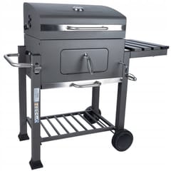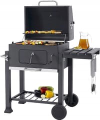 Duży, pojemny grill na kołach wersja DELUXE. Odpowiednia wielkość komory, regulowane palenisko oraz regulacja powietrza pozwala uzyskać optymalną cyrkulację powietrza. Pokrywę wyposażono w uchwyty, zapobiegające poparzeniom. Użycie wysokiej jakości materiałów, m.in. znacznej grubości blachy ok 1mm, warunkują o bezpieczeństwie oraz długiej żywotności grilla. Półki zapewniają odpowiednio przestronne miejsce do przechowywania produktów spożywczych oraz akcesoriów kuchennych. Kółka ułatwiają przestawianie nawet rozpalonego grilla.
