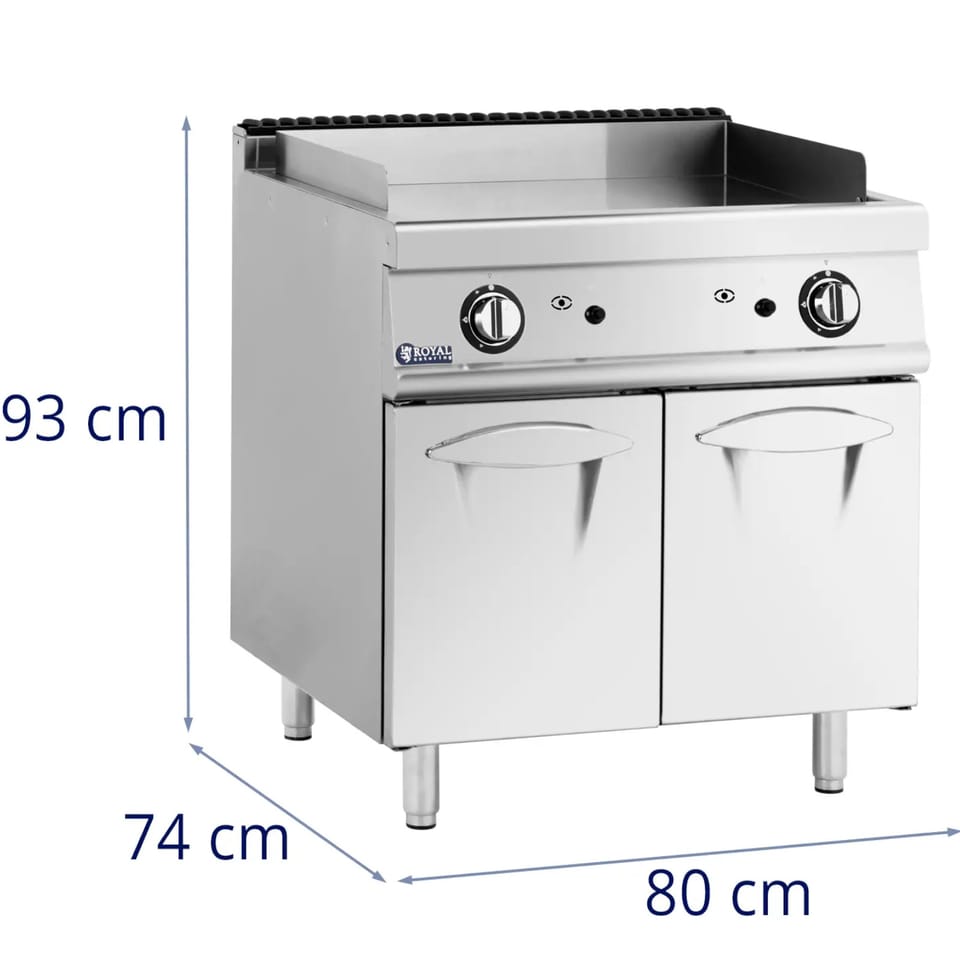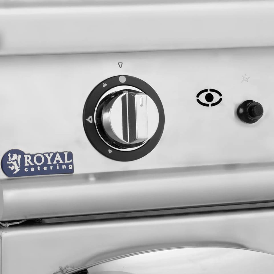 Kod producenta: 10013400Podwójny grill gazowy marki Royal Catering to solidny model z płytą grillową z chromowanej stali. Jest idealny dla branży gastronomicznej, czy to w hotelach, kawiarniach, food truckach, bistrach, barach, restauracjach czy na wszelkiego rodzaju imprezach cateringowych. Pod gładką powierzchnią do smażenia znajduje się pojemna szafka na garnki, patelnie i inne przybory kuchenne, które będą chronione przed kurzem. Otwiera się ją za pomocą drzwi na zawiasach i szybko można sięgnąć po jej zawartość. Na dużej powierzchni grilla można szybko przygotować mnóstwo kanapek, hamburgerów, tostów francuskich, tortilli i innych przysmaków. Gazowa płyta grillowa osiąga temperaturę od 50 do 300deg;C. Poziom grzania ustawia się za pomocą pokrętła. Urządzenie włącza się za pomocą zapłonu piezoelektrycznego. Ponadto model posiada też płomień zapalający. Urządzenie jest fabrycznie ustawione na gaz typu I3B/P(50), który idealnie sprawdzi się w wielu kuchniach gastronomicznych. W zakresie dostawy znajdują się dwa komplety dysz do konwersji płyty grillowej na gaz ziemny lub LPG. Nóżki o regulowanej wysokości zapewnią stabilną pozycję nawet na nierównym podłożu. Blokada płomienia, zaokrąglone krawędzie, zintegrowany okap i osłona przeciwbryzgowa zadbają o bezpieczeństwo podczas użytkowania. Obudowa i drzwi szafki wykonane są z wysokiej jakości stali nierdzewnej. Materiał jest nie tylko wytrzymały, ale także wyjątkowo higieniczny – idealny do codziennego użytku w profesjonalnych kuchniach. Gładkie powierzchnie są odporne na większość zabrudzeń i łatwo je wyczyścić. Można też wyjąć tacę ociekową, aby dokładniej umyć ją z tłuszczu.Cechy produktu: