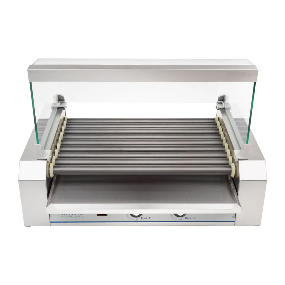 Nazwa producenta: RCHG-9TGrill rolkowy przeznaczony jest do szybkiego przygotowania kiełbasek i parówek HOT DOG. Urządzenie dobrze sprawdzi się w profesjonalnych kuchniach, barach, na stacjach paliwowych oraz w mobilnych punktach gastronomicznych.Rolki grzewcze wykonane zostały ze stali pokrytej TEFLONEM wysokiej jakości, który zapobiega przywieraniu podgrzewanych produktów i ułatwia późniejsze czyszczenie.Dzięki płynnej regulacji temperatury można dokładnie sterować procesem przygotowania potraw. Dwie oddzielnie sterowane strefy grzania pozwalają jednocześnie szybko opiekać oraz utrzymywać w cieple już gotowe kiełbaski.Urządzenie posiada lampki kontrolne wskazujące moc oraz gotowość urządzenia do pracy. Cechy i funkcje: