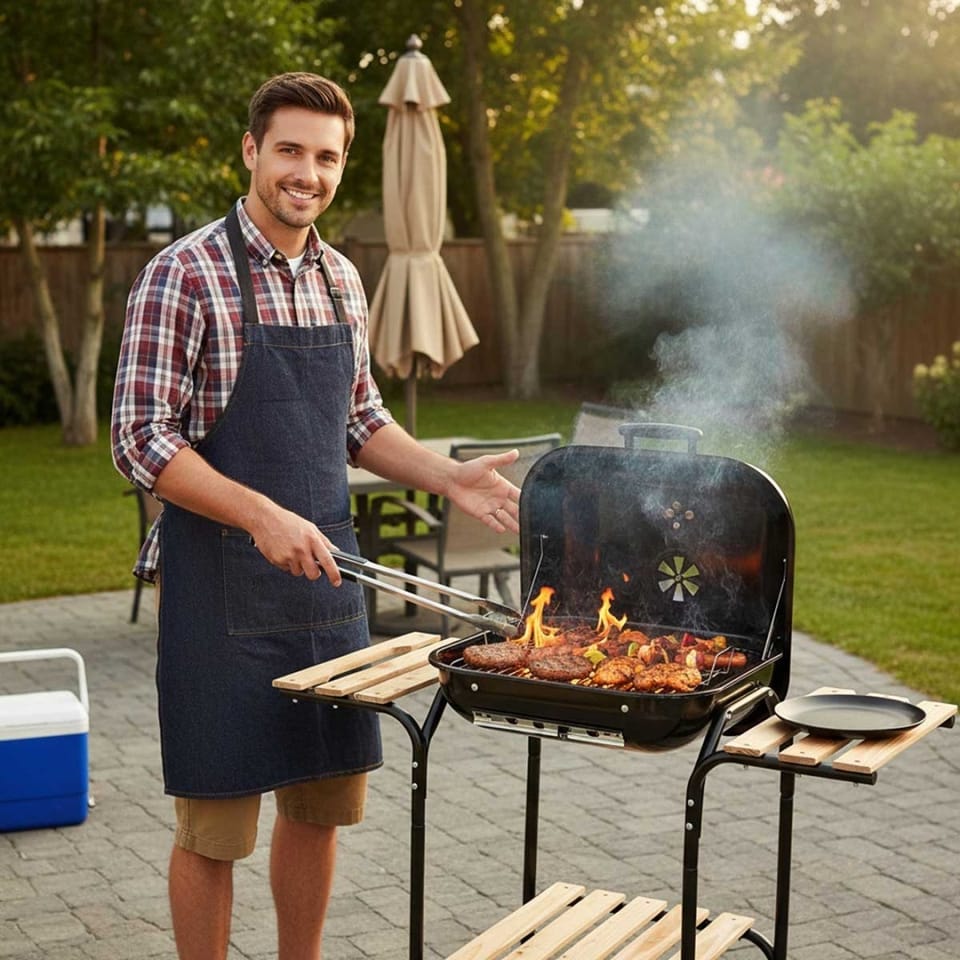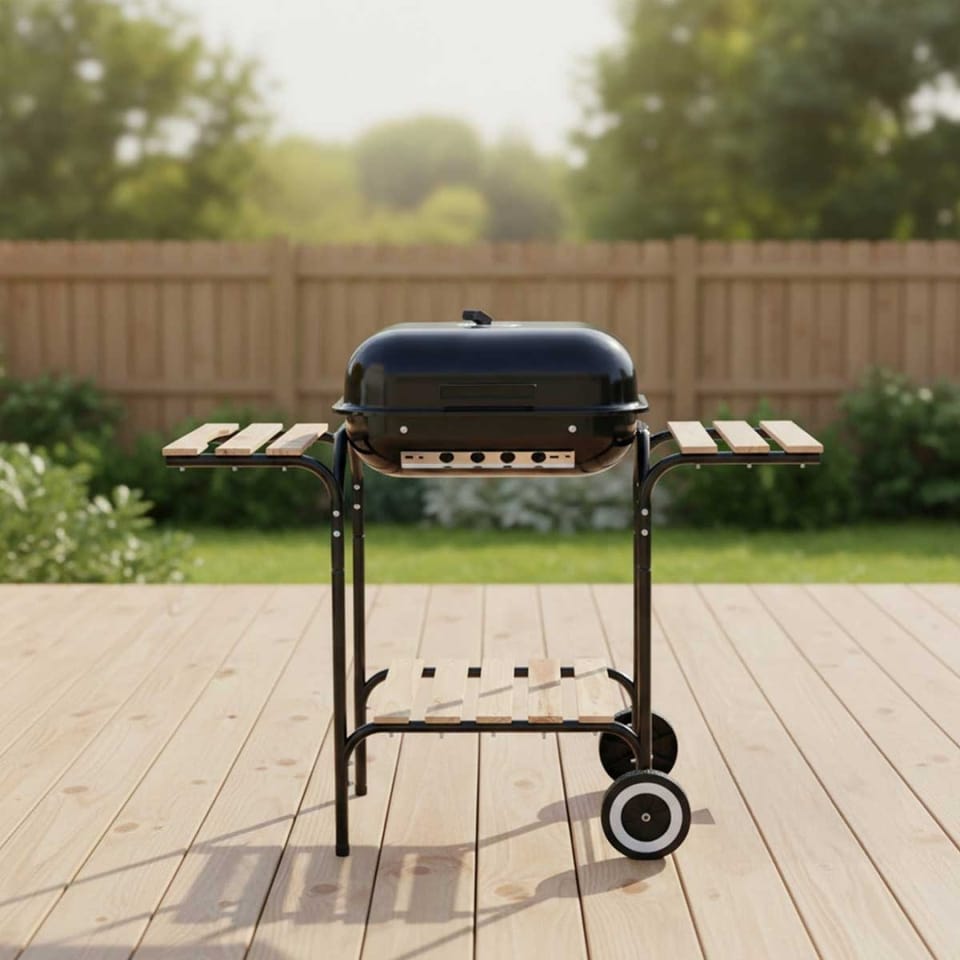 - Trzy praktyczne półki – dwie boczne na akcesoria i przyprawy oraz dolna na węgiel lub dodatki