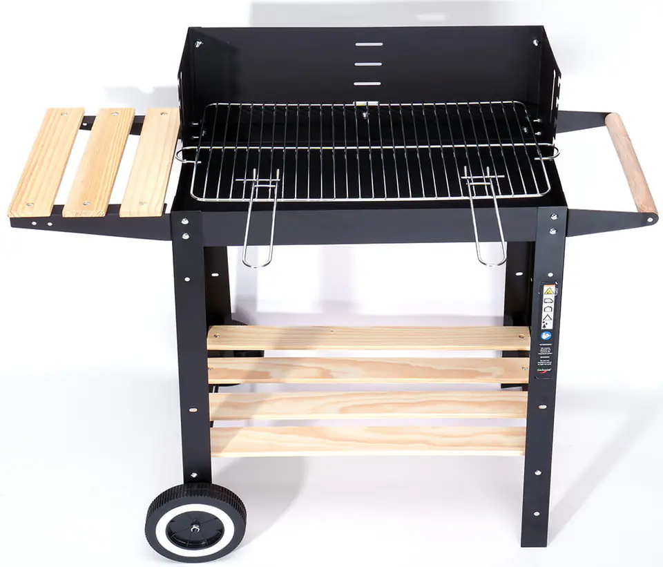 - Praktyczne półki: Grill wyposażony jest w małą boczną drewnianą półkę pomocniczą, idealną do trzymania przypraw, narzędzi grillowych, czy potraw gotowych do grilowania. Dolna półka natomiast świetnie nada się jako półka na brykiet, węgiel czy inne akcesoria, co znacznie ułatwia organizację przestrzeni grillowej.