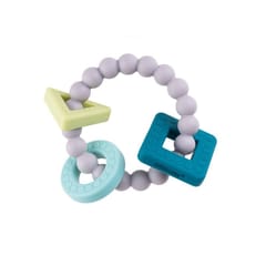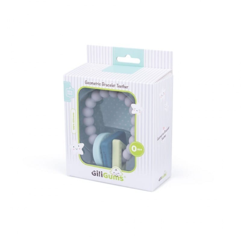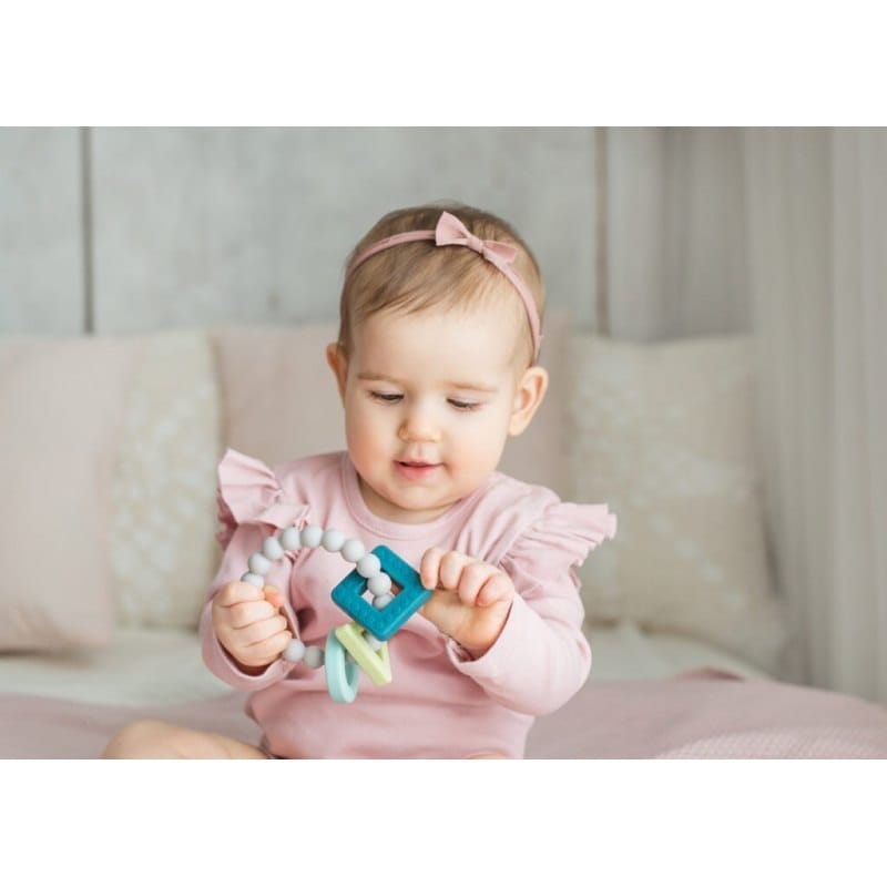 Stylowy, silikonowy gryzaczek - bransoletka z trzema zawieszkami w kształcie figur geometrycznych. Każda z zawieszek posiada inny kolor i fakturę. Zdobią je wypustki, które delikatnie masują dziąsła dziecka, przynoszą mu ulgę w ząbkowaniu. Gryzaczek jest miękki i odporny na zgniatanie. Produkt przeznaczony dla dzieci od dnia narodzin. Cechy produktu: wypustki do masowania dziąseł zróżnicowane faktury wykonany z silikonu wiek: 0m+ średnica gryzaka - ok. 9 cm