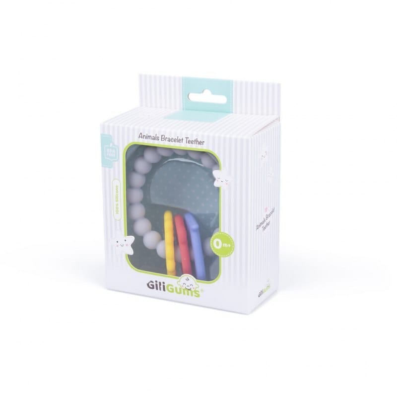 Gryzak Bransoletka Zwierzęta Silikonowy gryzak w formie koralikowej bransoletki z trzema zawieszkami: lwem, misiem i kotkiem. Każdy z doczepionych elementów różni się fakturą oraz kolorem. Zawieszki zdobią wypustki, które delikatnie masują obolałe dziąsła maluszka, przynoszą mu ulgę. Gryzaczek jest miękki i odporny na zgniatanie. Cechy produktu: -wypustki do masowania dziąseł -zróżnicowane faktury -wykonany z silikonu Wymiary: 16x6x13 cm Średnica gryzaka - ok. 9 cm Wiek: 0m+