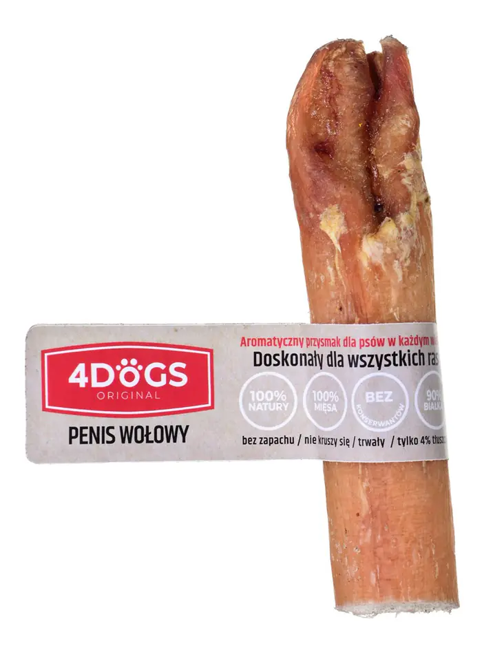 Penis wołowy to zdrowy przysmak dla psa! Cechuje się wysoką zawartością białka (90%) i małą ilością tłuszczu (5%).