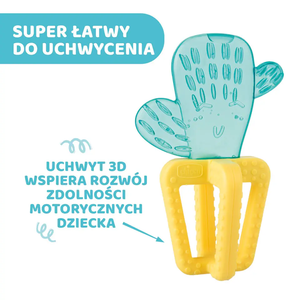Pobudza zmysły dziecka i chłodzi dziąsła. Powierzchnia z wypustkami pozwala na delikatny masaż dziąseł i ułatwia wyrzynanie pierwszycg ząbków.