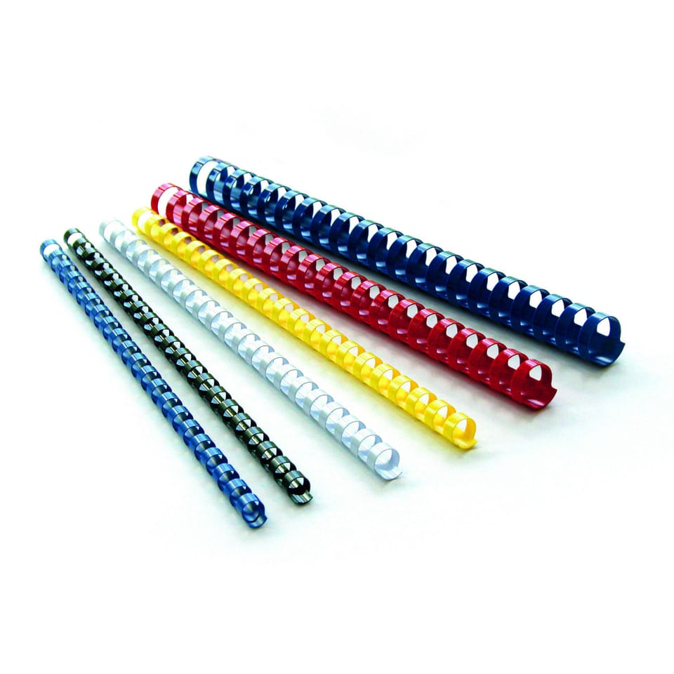 Grzbiety plastikowe w standardowych opakowaniach__ grzbiety plastikowe do bindowania_ dostępne kolory: biały, żółty, czerwony, zielony, niebieski, brązowy, czarny i przezroczysty_ dostępne rozmiary: 5, 6, 10, 12,5, 14, 16, 19, 22, 25, 28,5, 32, 38, 45, 51 mm__ opakowanie 50 lub 100 sztuk w zależności od rozmiaru grzbietu