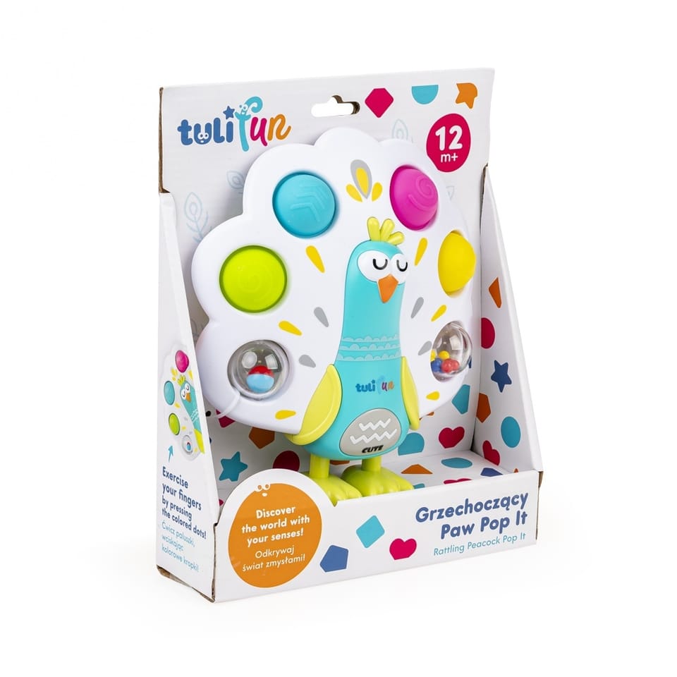 Wciśnij, obróć i zagrzechocz! W pawich piórkach ukryło się sześć kuleczek, a każda z nich zapewni małym paluszkom rozrywkę. Cztery kolorowe kuleczki do wciskania zdobią zróżnicowane wzory, a zadaniem bobasa jest przepchnąć je na drugą stronę zabawki, a następnie z powrotem, na przód pawia. Dwie przezroczyste, obrotowe kulki to grzechotki. Jedna kryje w sobie pojedynczą kuleczkę, a druga, kolorowe koraliki. Dźwięk wydaje także brzuszek pawia, który został ozdobiony piszczałką.
