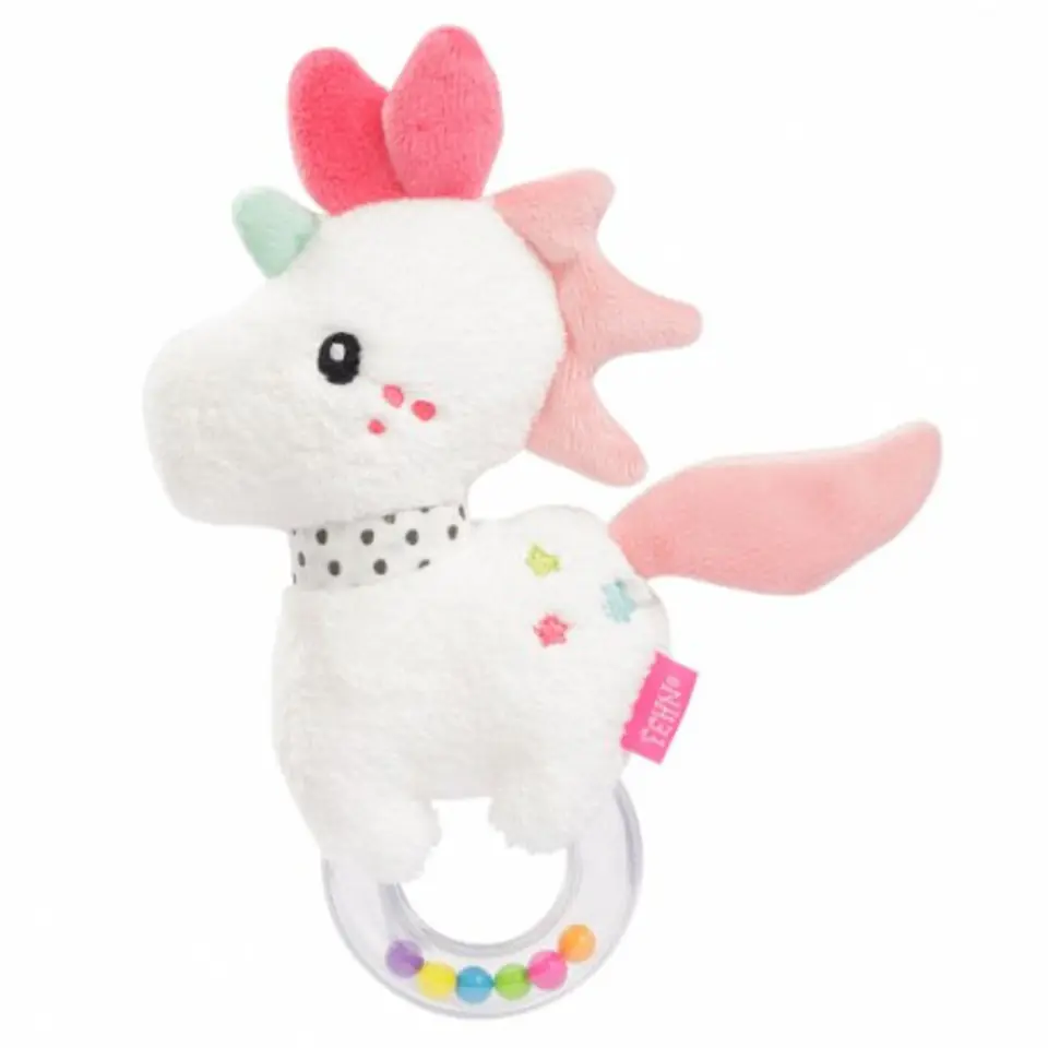 Grzechotka, maskotka, Jednorożec Aiko, z kolekcji: Aiko i Yuki Miękka, urocza grzechotka doskonale pasuje do małych rączek dzieci. Służy do trzymania, chwytania i potrząsania, wydając przy każdym ruchu delikatny dźwięk, co rozwija i pobudza zmysły, oraz doskonali zdolności motoryczne. Aksamitna w dotyku maskotka pochodząca z Japonii, wprowadza wiele radości i wywołuje uśmiech u każdego dziecka. Rozwija i pobudza zmysły. Doskonali zdolności motoryczne. Można prać. Rozmiar : 17 cm. Wszystkie zabawki niemieckiej marki FEHN są bezpieczne dla dzieci od 0 lat. Wykonane są z najlepszej jakości materiałów. Spełniają normy EN71, CE, badane w instytutach ""Stiftung Warentest"" lub ""Ökotest”. 57133