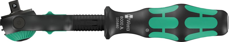 Grzechotka Zyklop 1/4". Wysokiej jakości wytrzymała powierzchnia, matowa, chromowana w kolorze czarnym. Drobna podziałka z 72 zębami zapewniająca niewielki kąt pracy wynoszący zaledwie 5°. Główkę grzechotki można swobodnie obracać i blokować w dowolnej pozycji za pomocą przełącznika suwakowego znajdującego się z obu stron narzędzia. Bezproblemowa praca nawet w bardzo wąskich lub trudno dostępnych miejscach. Możliwość ustawienia w pozycjach 0°, 15° i 90° w lewo i w prawo gwarantuje bezpieczną pracę bez ryzyka ześlizgnięcia się główki grzechotki. W pozycji 0° grzechotka z adapterem i bitem może być używana jak konwencjonalny wkrętak. Konstrukcja wykorzystująca masę własną narzędzia przyspiesza proces wkręcania. Symetryczna konstrukcja rękojeści Kraftform i tulei obrotowej wspomaga szybkie pokręcanie. Kształt rękojeści Kraftform, który jest idealnie dopasowany do dłoni, zapobiega powstawaniu pęcherzy i odcisków. Twarde materiały użyte do wykonania rękojeści umożliwiają szybkie uchwycenie narzędzia bez "przykleja