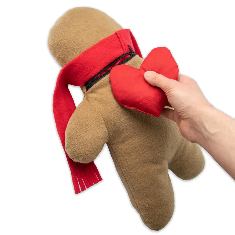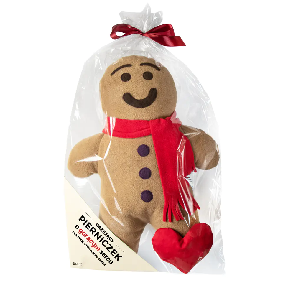 Pierniczek do przytulania Co jest sympatyczne, służy do przytulania i ma serce, którym można się ogrzać? Grzejący Pierniczek o Gorącym Sercu! Ta uśmiechnięta maskotka, która wygląda jak gigantyczny piernikowy ludzik chętnie dzieli się swoim ciepłem z każdym, kto zechce go przytulić. Postać ciastka-przytulanki skrywa bowiem prawdziwie gorące serce – grzejący wkład w kształcie serca wypełniony pestkami wiśni. Aby cieszyć się jego ciepłem, wystarczy zagrzać wkład w kuchence mikrofalowej lub piekarniku, a następnie włożyć go do kieszeni ukrytej pod szalikiem. Dla tych, których kochasz Grzejący Pierniczek to uosobienie ciepła, przytulności oraz Twojej miłości do osoby, której zechcesz go dać. Jeśli przyjaciółka lub siostra lubi się przytulać, a Ty chcesz podarować jej coś zaskakującego, oryginalnego, co ogrzeje i pomoże się odprężyć, to Grzejący Pierniczek będzie dobrym wyborem. Również jako prezent dla mamy lub babci sprawdzi się idealnie – ciastek może wiernie towarzyszyć i rozgrzewać podczas czytania lub oglądania telewizji. Prezent dla dziecka Grzejący Pierniczek jest niezwykle sympatyczną przytulanką, dlatego znajdzie miejsce w sercu niejednego dziecka. Chętnie ogrzeje każdego malucha, który będzie o niego dbał i z przyjemnością dołączy do misia, królika i innych zabawek mieszkających w pokoju dziecięcym. Pluszowy piernikowy ludzik to zabawka dla dziewczynki oraz dla chłopca, która doskonale sprawdzi się jako Walentynkowy prezent dla dzieci.Grzejący Pierniczek to bezpieczny produkt dla dzieci, który został wyprodukowany i przebadany w Polsce przez jednostkę certyfikującą, posiadającą akredytację Polskiego Centrum Akredytacji. Nie tylko na Walentynki i rocznice Trudno sobie wyobrazić lepszy prezent na Walentynki niż gorące serce - w końcu to święto miłości. Dla kobiety, którą kochasz, Grzejący Pierniczek o Gorącym Sercu będzie zaskakującym prezentem, który:- wzbudzi ciepłe uczucia,- będzie kojarzyć się z Tobą i przypominać o Twojej gorącej miłości,- ogrzeje ją w chłodne dni.A wszytko to dzięki termoforowi w kształcie serca, który, po wcześniejszym nagrzaniu, wkłada się do zamaskowanej kieszeni Pierniczka. Ta rozgrzewająca maskotka to romantyczny prezent dla dziewczyny, narzeczonej lub żony, który sprawdzi się również na rocznicę. Jak grzeje Pierniczek Termofor z pestek wiśni, który znajduje się w zapinanej na zamek kieszonce Grzejącego Pierniczka, będzie przyjemnie rozgrzewać i relaksować. Wystarczy wyjąć go z kieszeni, włożyć na chwilę do mikrofalówki lub piekarnika elektrycznego i ponownie umieścić go wewnątrz kieszeni. I choć sam Pierniczek nie ma korzennego zapachu świątecznych wypieków to jego wkład, kiedy jest ciepły, pachnie bardzo przyjemnie – lekkim wiśniowym aromatem.