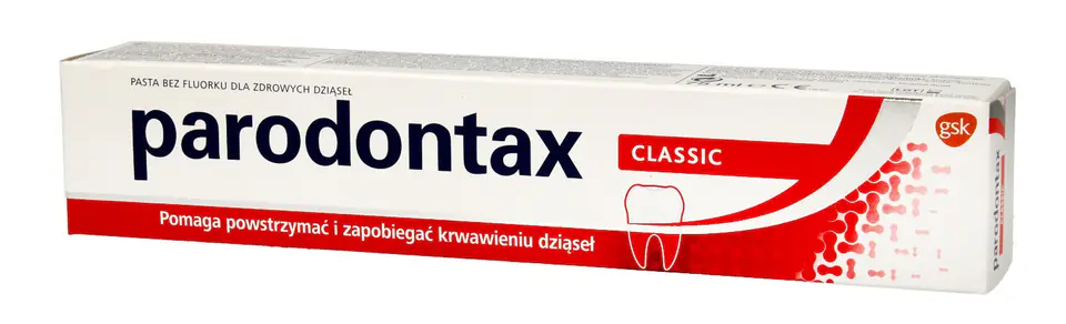 Parodontax Classic pasta do zębów to specjalistyczna pasta do zębów zawierająca unikalną kombinację soli mineralnych i naturalnych wyciągów z ziół: jeżówki, rumianku, szałwi, mirry, ratani oraz miety. Gwarantuje skuteczne zapobieganie i leczenie podrażnionych dziąseł i chorób przyzębia. Nie zawiera fluoru. Codzienne stosowanie pasty Parodontax Classic chroni przed podrażnieniami dziąseł, wzmacnia dziąsła, przyśpiesza gojenie, czyści dokładnie i delikatnie oraz zapewnia uczucie długotrwałej świeżości.