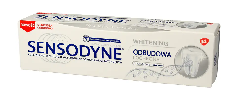 Pasta Sensodyne Odbudowa i Ochrona Whitening zawiera NovaMin - unikalną technologię początkowo opracowaną do regeneracji tkanki kostnej, a obecnie wykorzystywaną w różnorodnych, profesjonalnych produktach stomatologicznych. Związek wapnia pomaga w odbudowie wrażliwych miejsc zębów, wykorzystując do tego celu takie same składniki jak te, z których zbudowane są zęby. NovaMin® aktywuje się w kontakcie ze śliną i uwalnia jony wapnia i fosforu – naturalne składniki budulcowe zębów. Tworzą one trwałą, mineralną warstwę ochronną na powierzchni odsłoniętej zębiny i wewnątrz otwartych kanalików zębinowych. Warstwa ta zaczyna tworzyć się już od pierwszego szczotkowania i utwardza się w trakcie regularnego stosowania pasty, dzięki czemu zapobiega bólowi wywołanemu nadwrażliwością w przyszłości. Pasta z fluorkiem