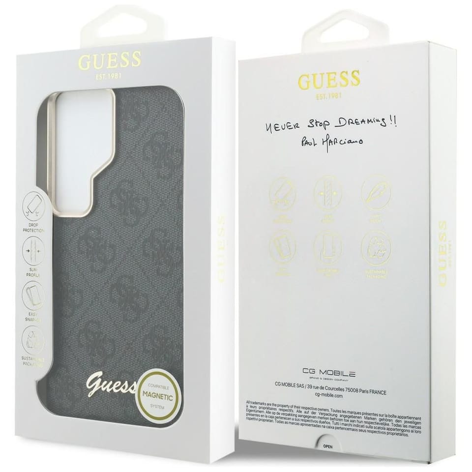 Guess 4G Script Logo MagSafe charakteryzuje się jednym z bardziej znanych motywów używanych przez Guess. Cały tylny panel etui pokryto emblematami 4G, które umiejscowiono na bardzo przyjemnej w dotyku fakturze saffiano. Złote logo Guess na dole. Połączenie tych elementów sprawia, że całość prezentuje się bardzo elegancko.Etui ochrania tył, boki oraz przyciski urządzenia, zapewniając dostęp do wszystkich jego funkcjonalności.Lekko poniesione ramki wokół wyświetlacza oraz obiektywu kamery, chronią przed zarysowaniami.Etui zostało wyposażone w magnetyczny pierścień, który jest kompatybilny z bezprzewodową ładowarką MagSafe, co umożliwia szybkie i wygodne ładowanie.Cechy produktu:· Wbudowany pierścień magnetyczny kompatybilny z ładowarką MagSafe· Przyjemna faktura saffiano· Złote logo Guess· Ochrona tyłu, boków i przycisków urządzenia· Zabezpieczenie przed wstrząsami, uderzeniami i porysowaniem· Perfekcyjne dopasowanie do telefonu· Dostęp do wszystkich klawiszy funkcyjnych, gniazd i portów telefonu· Oficjalne licencja Guess*UWAGA: Ładowarka MagSafe nie jest częścią zestawu