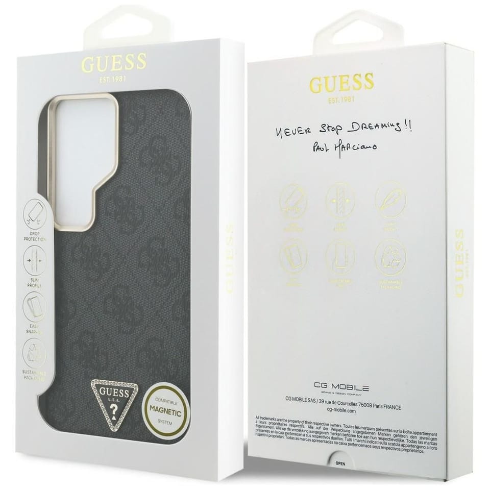 Guess 4G Triangle Logo MagSafe charakteryzuje się jednym z bardziej znanych motywów używanych przez Guess. Cały tylny panel etui pokryto emblematami 4G, które umiejscowiono na bardzo przyjemnej w dotyku fakturze saffiano. Trójkątne logo Guess na dole. Połączenie tych elementów sprawia, że całość prezentuje się bardzo elegancko.Etui ochrania tył, boki oraz przyciski urządzenia, zapewniając dostęp do wszystkich jego funkcjonalności.Lekko poniesione ramki wokół wyświetlacza oraz obiektywu kamery, chronią przed zarysowaniami.Etui posiada wewnątrz magnetyczny pierścień kompatybilny z akcesoriami MagSafe gwarantując łatwe i szybkie ładowanieCechy produktu:· Wbudowany pierścień magnetyczny kompatybilny z ładowarką MagSafe· Przyjemna faktura saffiano· Trójkątne logo Guess· Ochrona tyłu, boków i przycisków urządzenia· Ramka aparatu oraz przyciski wykończone w srebrnym kolorze· Zabezpieczenie przed wstrząsami, uderzeniami i porysowaniem· Perfekcyjne dopasowanie do telefonu· Dostęp do wszystkich klawiszy funkcyjnych, gniazd i portów telefonu· Oficjalna licencja Guess*UWAGA: Ładowarka MagSafe nie jest częścią zestawu