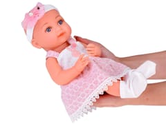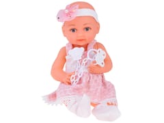Lalka została wykonana z twardej gumy z dbałością o detale. Uwagę zwracają duże, niebieskie oczy, otoczone długimi, odstającymi rzęsami. Oczy bobasa nie zamykają się. Sympatyczna minka lalki zachęca do zabawy. Bobas ubrany jest w śliczną biało-różową sukienkę ozdobioną króliczkiem z pomponikiem oraz koronką. Dzidziuś co prawda nie ma włosków, ale jego główkę ozdabia opaska z tiulową kokardą i perełką. Na nóżkach nosi białe skarpetki.