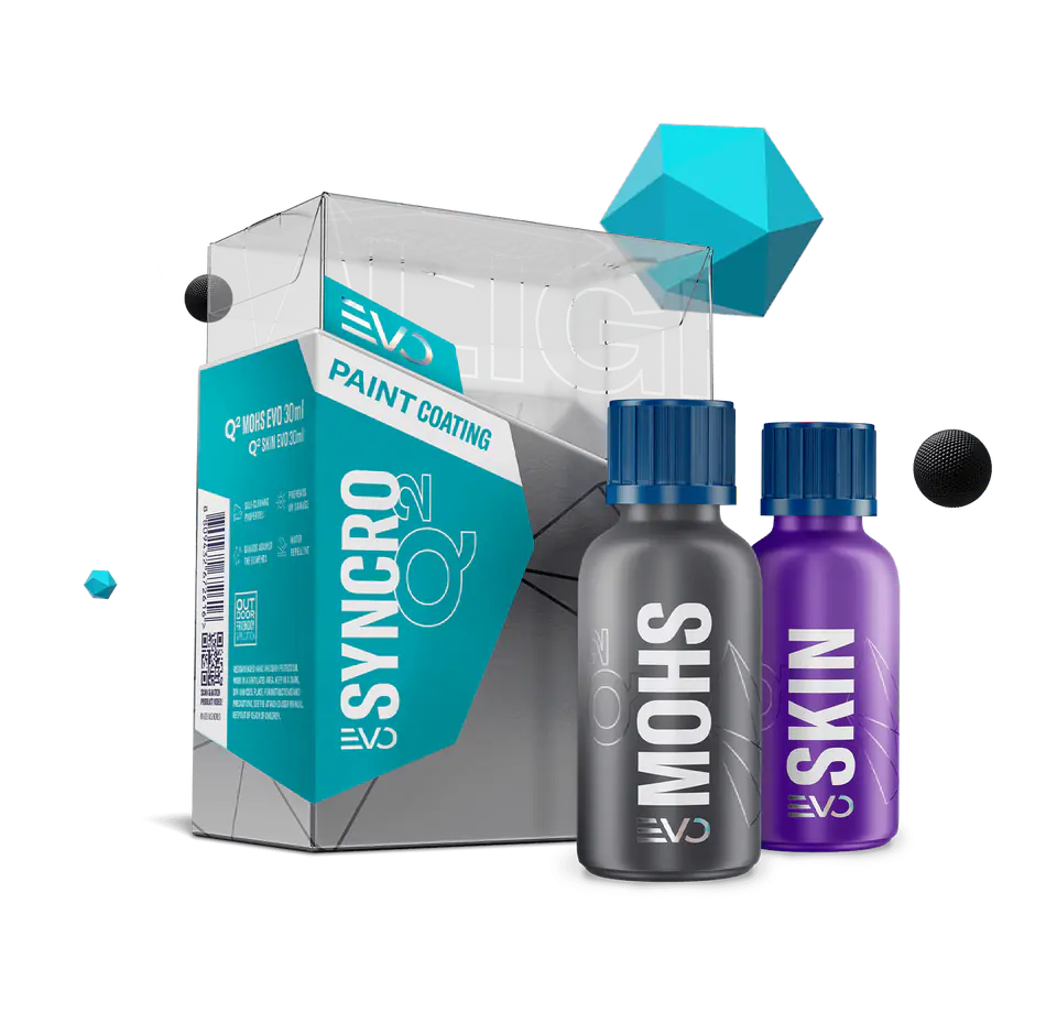 Q² Syncro EVO to niepowtarzalna okazja do nałożenia specjalnie zaprojektowanego systemu powłok składającego się z wyjątkowej powłoki bazowej Q² Mohs EVO oraz warstwy wierzchniej Q² Skin EVO, która znacząco zwiększa połysk i trwałość efektu hydrofobowego. Warstwa wierzchnia zapewnia również bardzo silne wzmocnienie koloru, łatwo zauważalne na ciemnych lakierach.