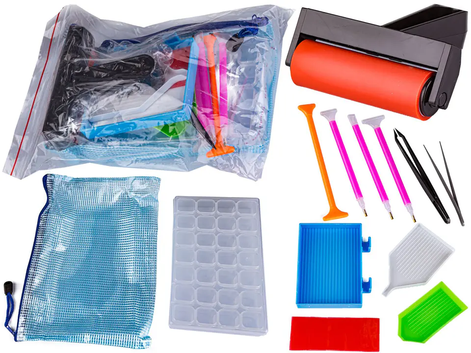 Zestaw dodatkowych akcesoriów do haftu diamentowego, który składa się z wielu przydatnych elementów. Zestaw ten ułatwi i uprzyjemni zabawę w wyklejanie diamencików.