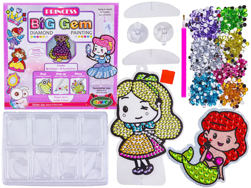 Haft diamentowy lub po prostu mozaika diamentowa to super pomysł na kreatywne spędzanie wolnego czasu. Układanka pozwala się odprężyć i wyciszyć. To świetny pomysł na relaks.Oferowany zestaw zawiera wszystkie niezbędne elementy do wykonania gotowych układanek w tematyce księżniczek :) Zabawa polega na tym aby odpowiednimi, bajecznie kolorowymi diamencikami wyłożyć pola na naklejkach.