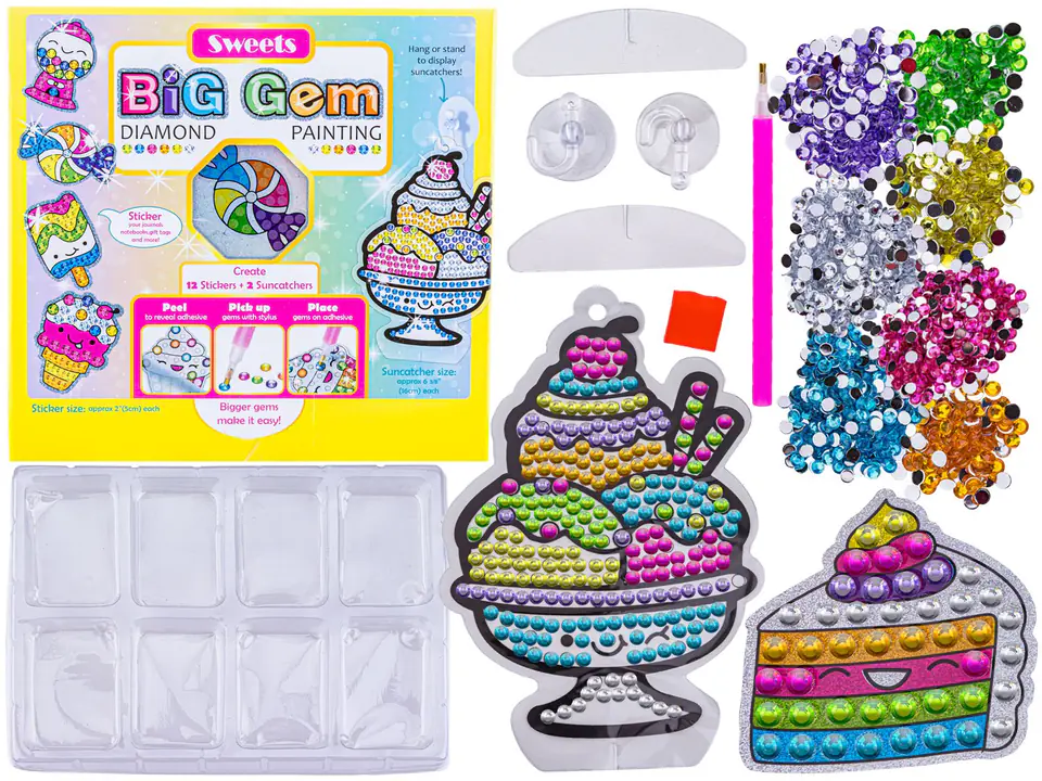 Haft diamentowy lub po prostu mozaika diamentowa to super pomysł na kreatywne spędzanie wolnego czasu. Układanka pozwala się odprężyć i wyciszyć. To świetny pomysł na relaks.Oferowany zestaw zawiera wszystkie niezbędne elementy do wykonania gotowych układanek w tematyce słodkości :) Zabawa polega na tym aby odpowiednimi, bajecznie kolorowymi diamencikami wyłożyć pola na naklejkach.