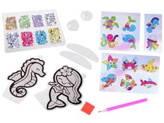 Haft diamentowy zestaw kreatywny MORSKI to najmodniejsza kreatywna zabawa dla dzieci tego sezonu. Zestaw pozwala na stworzenie pięknych wzorów z bajecznie kolorowych diamencików. Zabawa polega na dobraniu odpowiednich kolorów diamencików i przeniesienie je na szablon z klejem za pomocą specjalnego długopisu. Po ułożeniu elementów uzyskujemy piękną kolorową ozdobę. Za pomocą dołączonych do zestawu: plastikowych podstawek oraz silikonowych przyssawek z haczykami wykonane prace można postawić np. na biurku, na półce, zawiesić na szybie, lustrze lub ozdobić nimi ulubiony zeszyt, teczkę lub pamiętnik.Układanie maleńkich elementów jest bardzo wciągające, przy okazji ćwiczy koordynację ręka-oko, uczy cierpliwości, pobudza kreatywność dziecka.