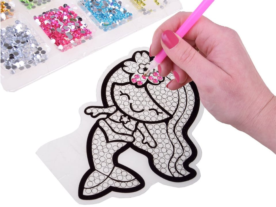 Sposób użycia:1. Przygotowanie stanowiska pracy. W celu ułatwienia pracy rozdzielamy kolorowe diamenciki do poszczególnych okienek na tacy.2. Oddzielamy foliową warstwę ochronną od szablonu lub naklejki dopiero bezpośrednio przed rozpoczęciem pracy, ponieważ są one pokryte warstwą klejącą umożliwiającą przyklejanie diamencików. Dzięki temu reszta warstwy klejącej nie wyschnie.3. Końcówkę długopisu-aplikatora wbijamy w wosk (tzw. suchy klej) teraz diamencik będzie przyklejał się do jego końcówki i w ten sposób łatwo i precyzyjnie umieścimy element w wybranym miejscu.4. Jeżeli diamencik został źle wklejony, dopóki warstwa klejąca nie wyschnie, diamenciki można usuwać i przyklejać ponownie w tym samym miejscu.