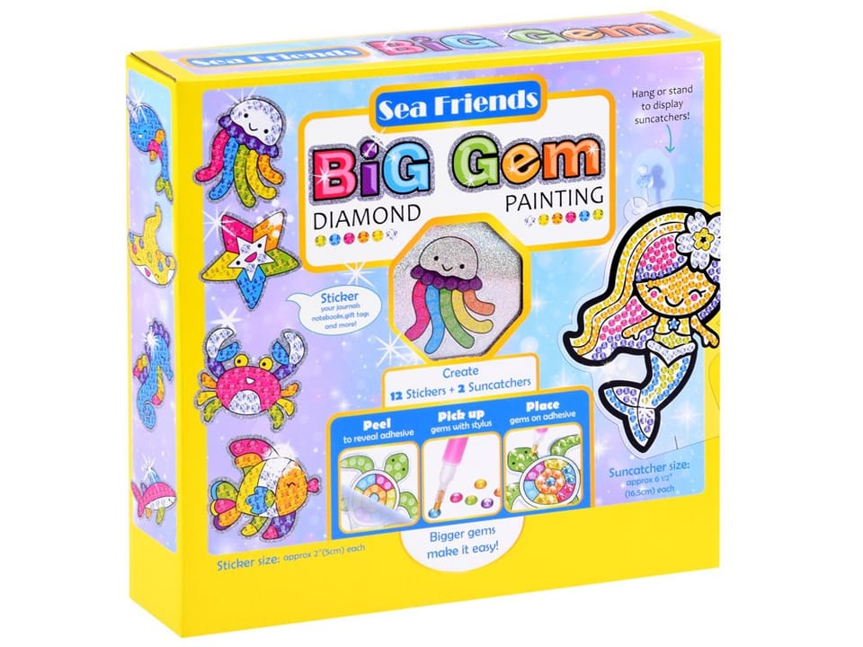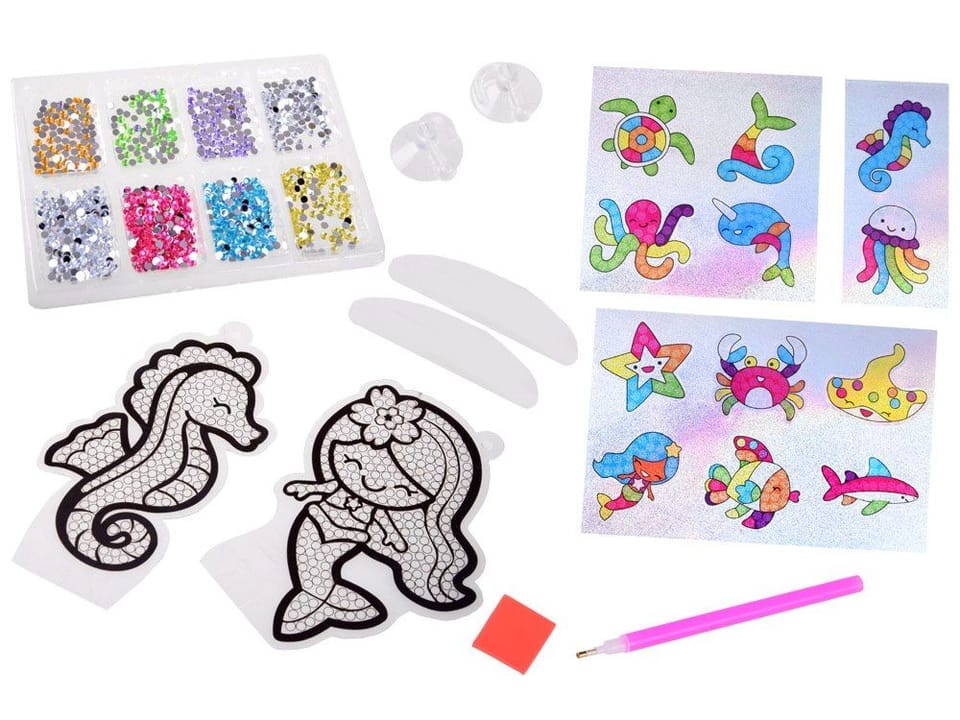 Zestaw zawiera: - 2 duże szablony do postawienia lub zawieszenia- 12 wzorów brokatowych naklejek- 7 woreczków z kolorowymi diamencikami ok. 1000 szt. (zielony, żółty, różowy, niebieski, fioletowy, pomarańczowy, srebrny)- 2 przyssawki z haczykami- 2 plastikowe podstawki- plastikowa tacka do segregacji kolorów- wosk- rysik/długopis/aplikator do przyklejania diamentówWymiary:- szablony duże ok.: 17 cm x 12 cm- naklejki ok.: 5,5 cm x 6 cm- kostka wosku: 2 cm x 2 cm- długopis: 12,5 cm- taca: 20,5 cm x 14,5 cm x 1,5 cm- podstawka plastikowa: 7 cm x 2 cm- przyssawka: 2,5 cm x 2 cmUWAGA! Ze względu na zawartość małych elementów diamencików, konieczny jest stały nadzór osoby dorosłej. Obecność malutkich elementów grozi połknięciem lub zachłyśnięciem. Zadbajcie o bezpieczeństwo podczas pracy!