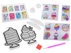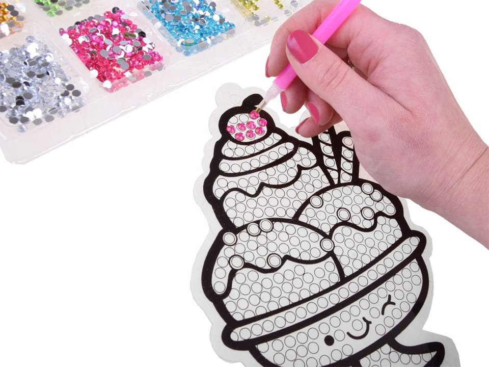 Haft diamentowy zestaw kreatywny SŁODYCZE to najmodniejsza kreatywna zabawa dla dzieci tego sezonu. Zestaw pozwala na stworzenie pięknych wzorów z bajecznie kolorowych diamencików. Zabawa polega na dobraniu odpowiednich kolorów diamencików i przeniesienie ich na szablon z klejem za pomocą specjalnego długopisu. Po ułożeniu elementów uzyskujemy piękną kolorową ozdobę. Za pomocą dołączonych do zestawu: plastikowych podstawek oraz silikonowych przyssawek z haczykami wykonane prace można postawić np. na biurku, na półce, zawiesić na szybie, lustrze lub ozdobić nimi ulubiony zeszyt, teczkę lub pamiętnik.Układanie maleńkich elementów jest bardzo wciągające, przy okazji ćwiczy koordynację ręka-oko, uczy cierpliwości, pobudza kreatywność dziecka.
