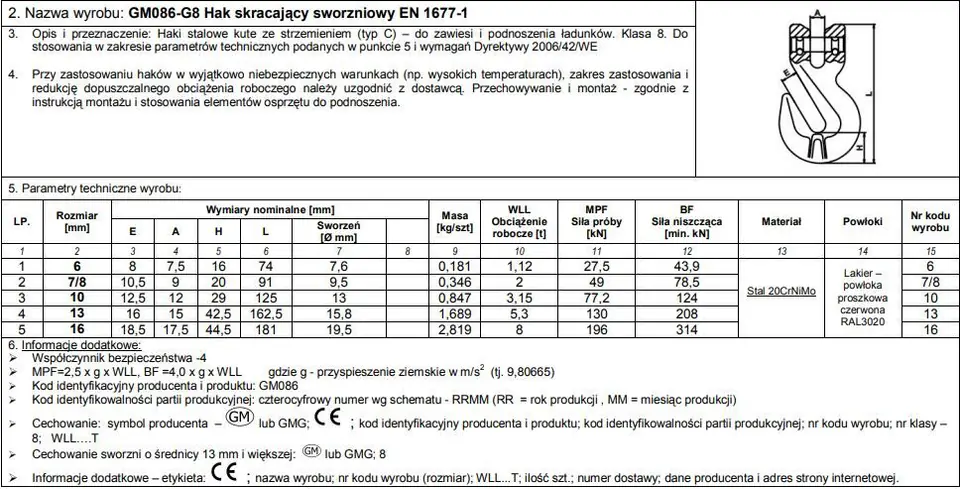 HAK SKRACAJĄCY ZE SWORZNIEM 13MM G8 WILL 5.3T