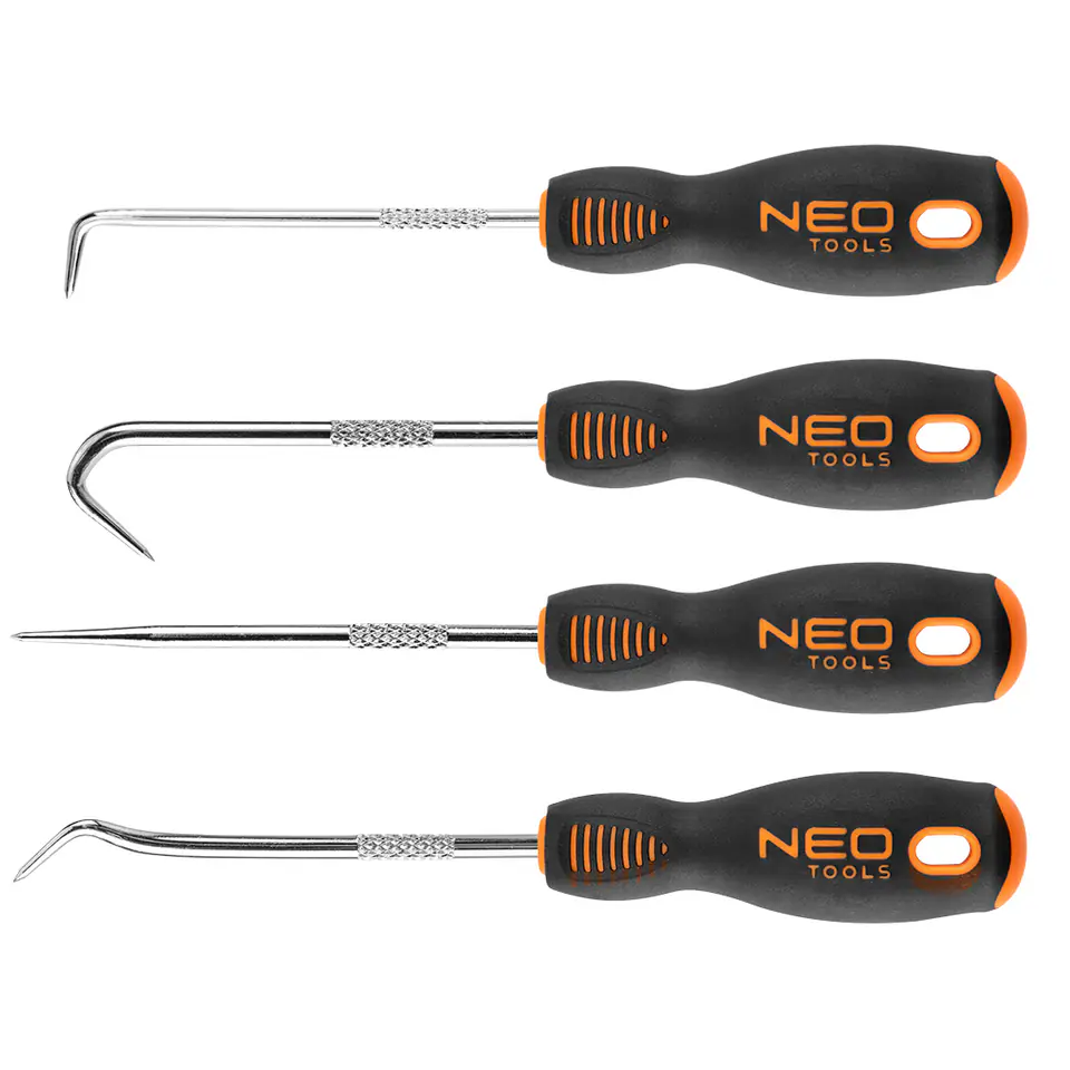 Haki 150 mm, zestaw 4 szt., stal CS, trójgraniasty kształt uchwytu, wyprofilowane oparcie dla kciuka, uchwyt pokryty tworzywem TPR odpornym na działanie chemikaliów, olejów mineralnych, smarów