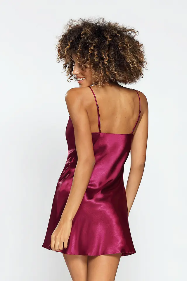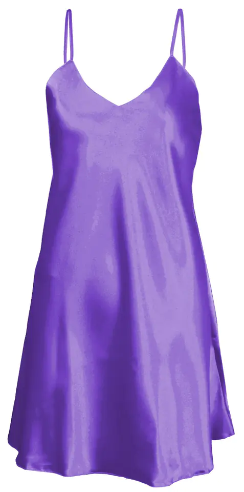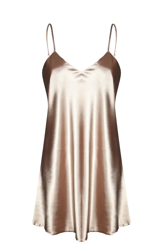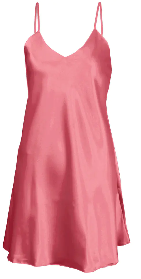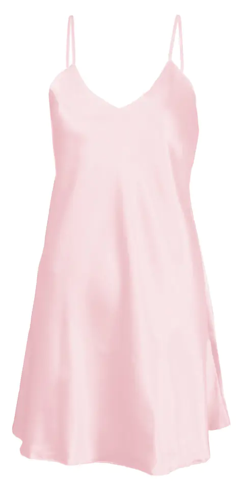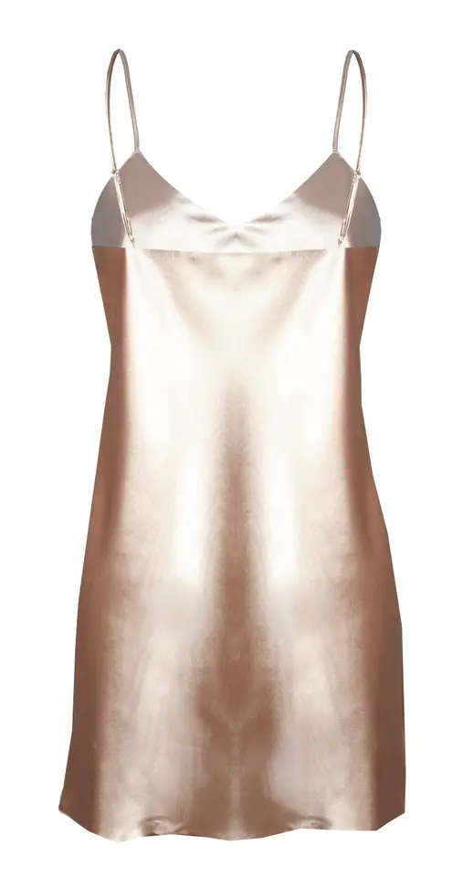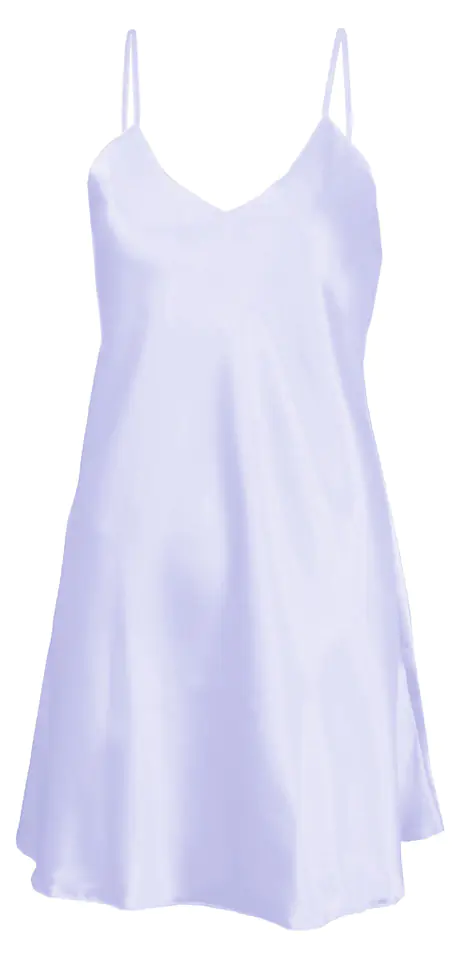 GŁADKA HALKA USZYTA ZE ZWIEWNEJ SATYNY. PRZÓD HALKI TWORZY DELIKATNY TRÓJKĄTNY DEKOLT. RAMIĄCZKA SĄ CIENKIE I REGULOWANE.