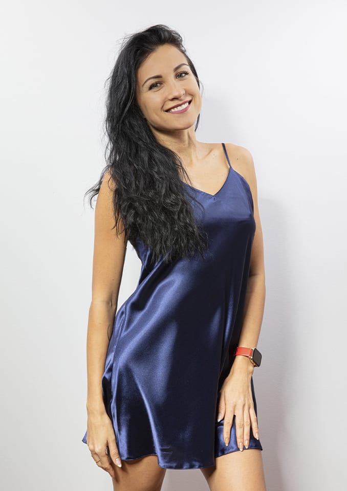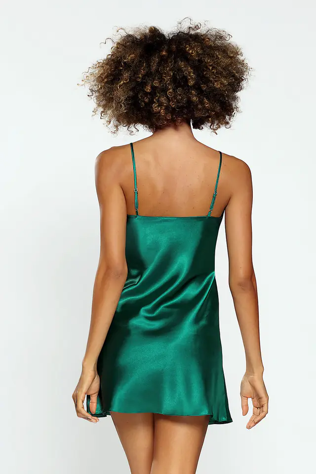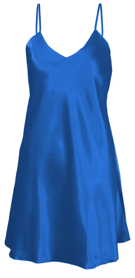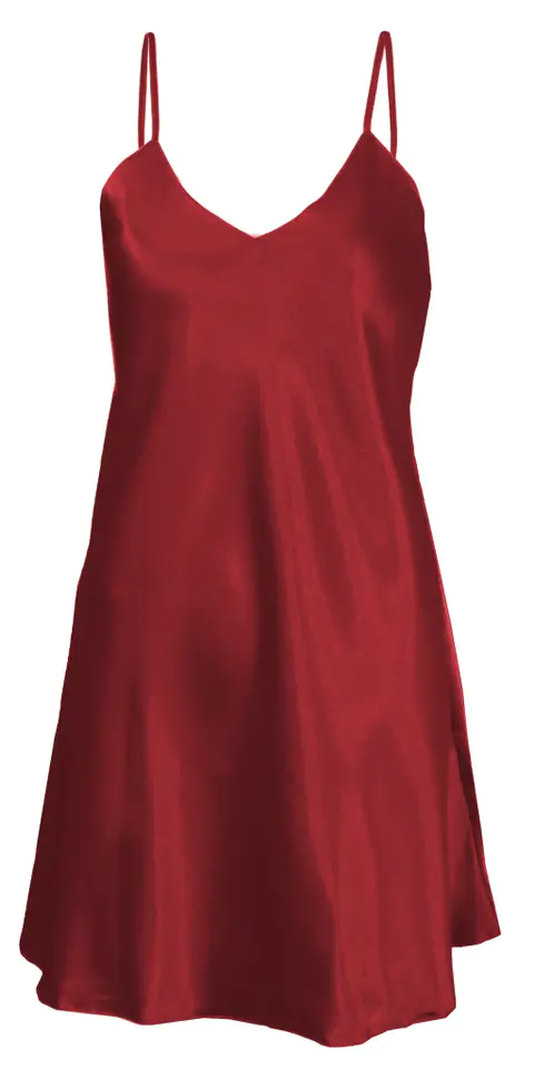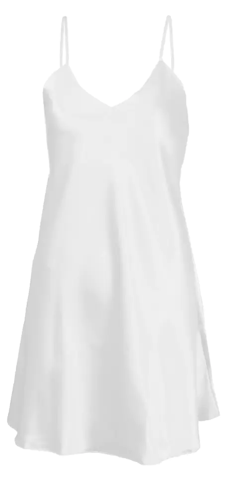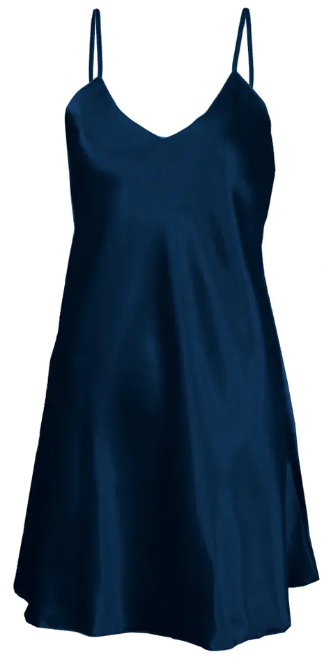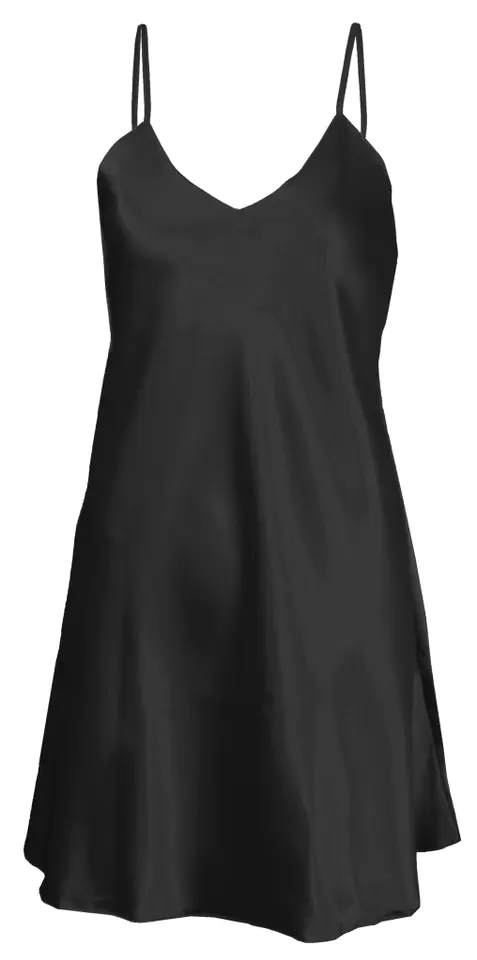 GŁADKA HALKA USZYTA ZE ZWIEWNEJ SATYNY. PRZÓD HALKI TWORZY DELIKATNY TRÓJKĄTNY DEKOLT. RAMIĄCZKA SĄ CIENKIE I REGULOWANE.