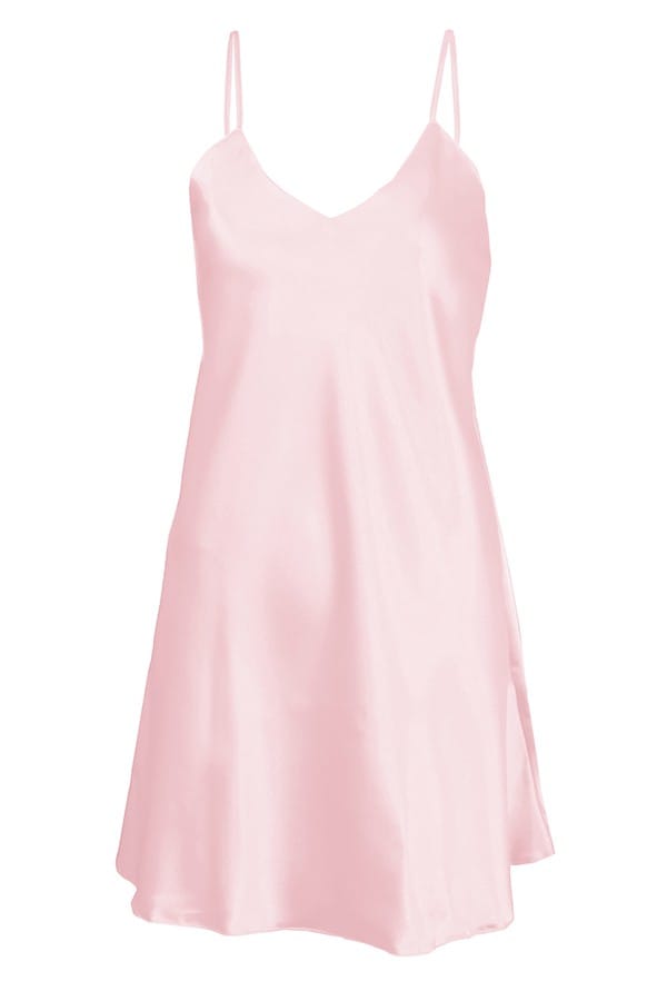 GŁADKA HALKA USZYTA ZE ZWIEWNEJ SATYNY. PRZÓD HALKI TWORZY DELIKATNY TRÓJKĄTNY DEKOLT. RAMIĄCZKA SĄ CIENKIE I REGULOWANE.