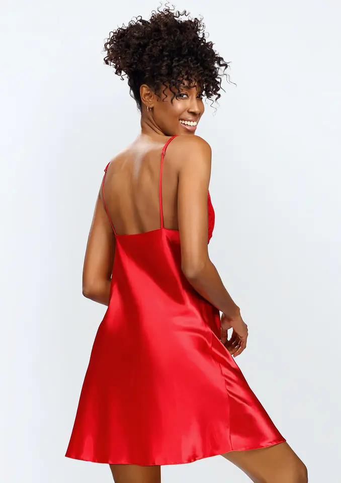 Halka Neema posiada bogato wykończoną górę. Gorsetowy krój koronki w połączeniu z satynowym dołem. Jest bardzo kobieca i zmysłowa. Halka Neema dostępna jest w 2 kolorach czerwonym i czarnym. Satynowa koszulka nocna z koronką to doskonały wybór na romantyczną noc z partnerem. Koronka dodaje koszulce seksowności i zmysłowości, a satyna jest delikatna i przyjemna w dotyku.