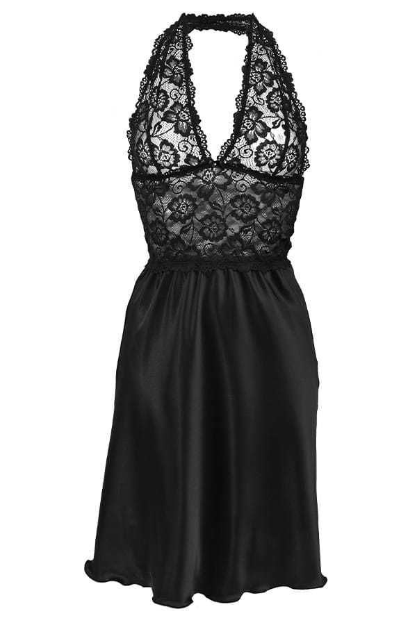 HALKA Z SATYNY I KORONKI. GÓRĘ TWORZĄ DOPASOWANE PROFILOWANE MISECZKI Z WZORZYSTEJ KORONKI PRZEKŁADANEJ PRZEZ SZYJĘ. PRZÓD OZDOBIONY MAŁĄ KOKARDKĄ Z BIŻUTERYJNĄ ŁEZKĄ. MATERIAŁ: SATYNA.