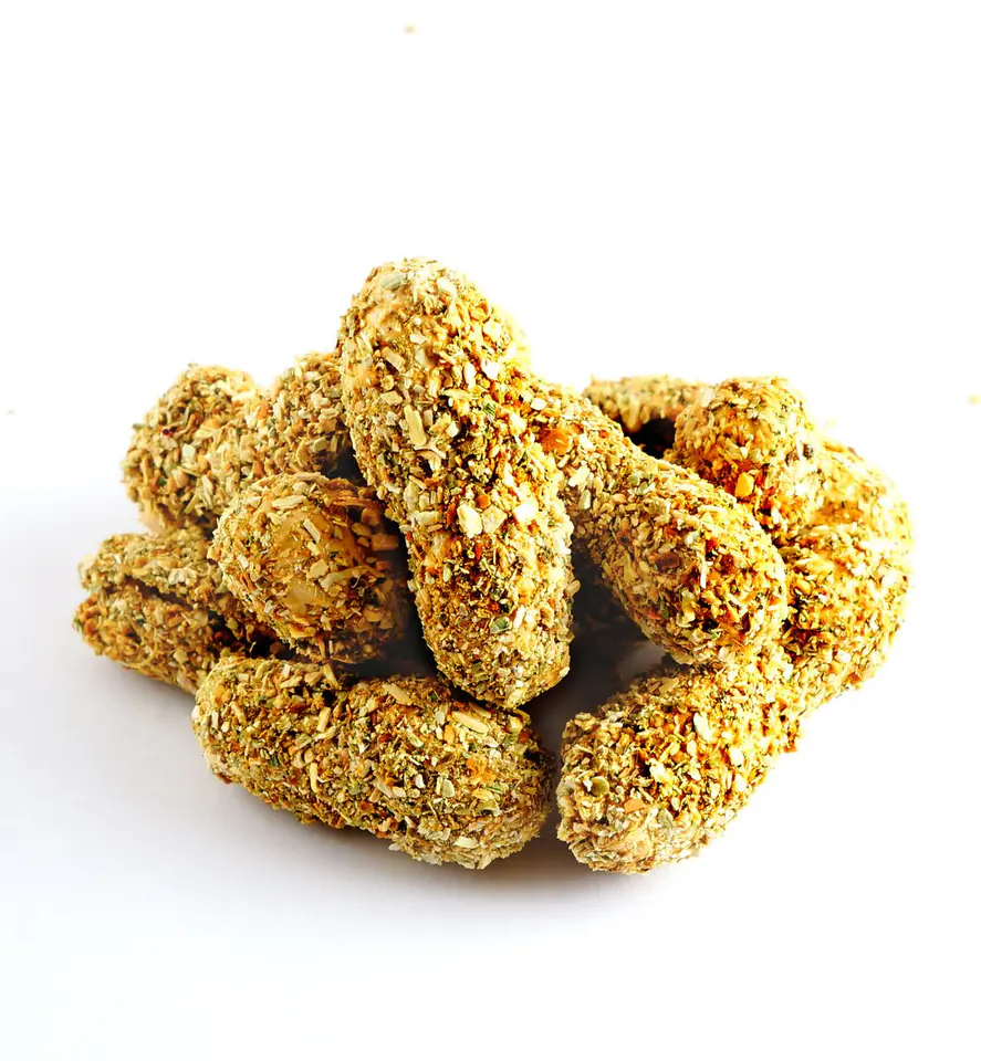 Podwójnie chrupiące pralinki orzechowe w rozmaitych „panierkach”: len, brokuł, mięta, marchew, burak, natka pietruszki. Od wyboru do koloru!