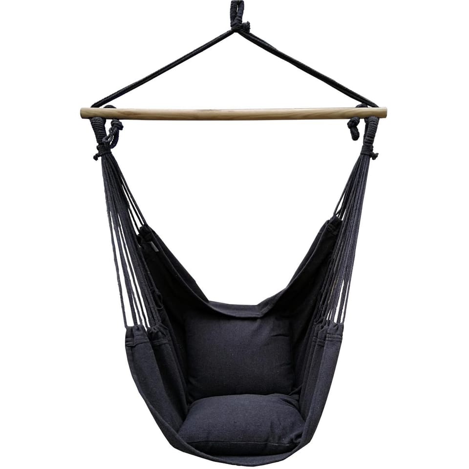 - Wymiary ok.: 100x130cm/ poduszki 40x40cmMateriał: bawełna 35%, poliester 65%, bawełniane sznurki 300g/m2, drewnoDługość drążka: 90 cmKolor: czarnyMaksymalne obciążenie: 120 kgWaga netto: 1,9 kgMarka: Saska Garden