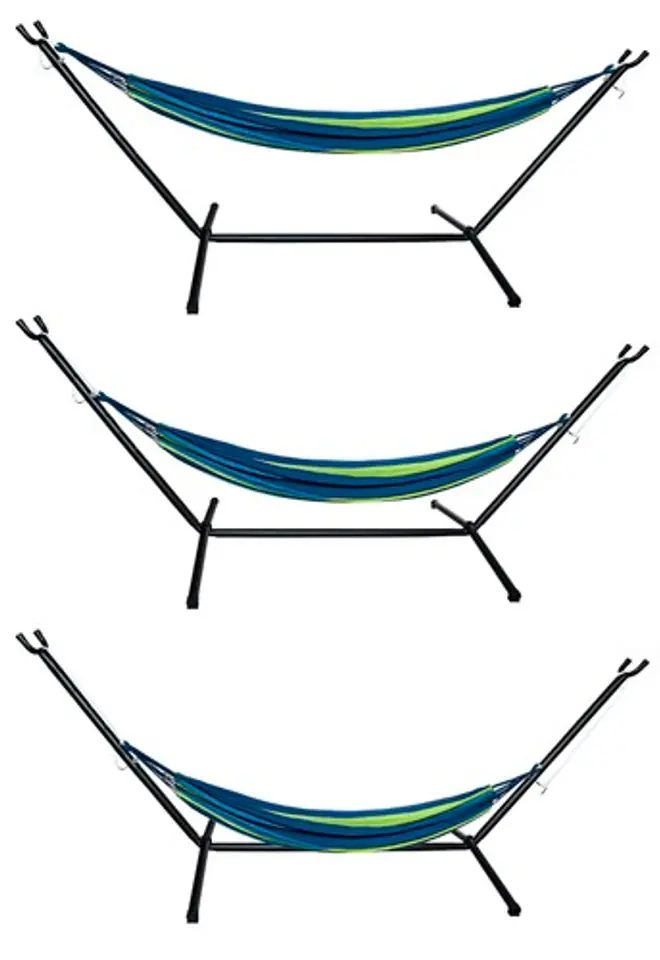 - SPECYFIKACJA - kolor: wielokolorowy; materiał: tworzywo sztuczne, tkanina, stal; maksymalne obciążenie: 200 kg; wymiary stelaża(szer/wys): 260/110 cm; wymiary hamaka (dł/szer): 200/150 cm; waga: 13 kg; waga w opakowaniu: 13,5 kg.