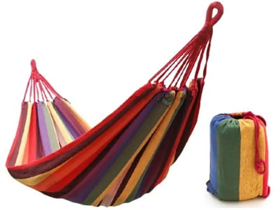 Wygodny i funkcjonalny hamak ogrodowy. Został wykonany z materiałów najwyższej jakości, materiał to bawełna i poliester. Bawełna to naturalny i oddychający materiał, znany ze swoich elastycznych właściwości a poliester to syntetyczny materiał, który dodaje się do bawełny, żeby przedłużyć jej trwałość i wzmocnić ją. Materiał świetnie nadaje się do prania. Hamak na tyle duży, że spokojnie pomieszczą się w nim dwie osoby, co więcej można w nim leżeć także w poprzek.