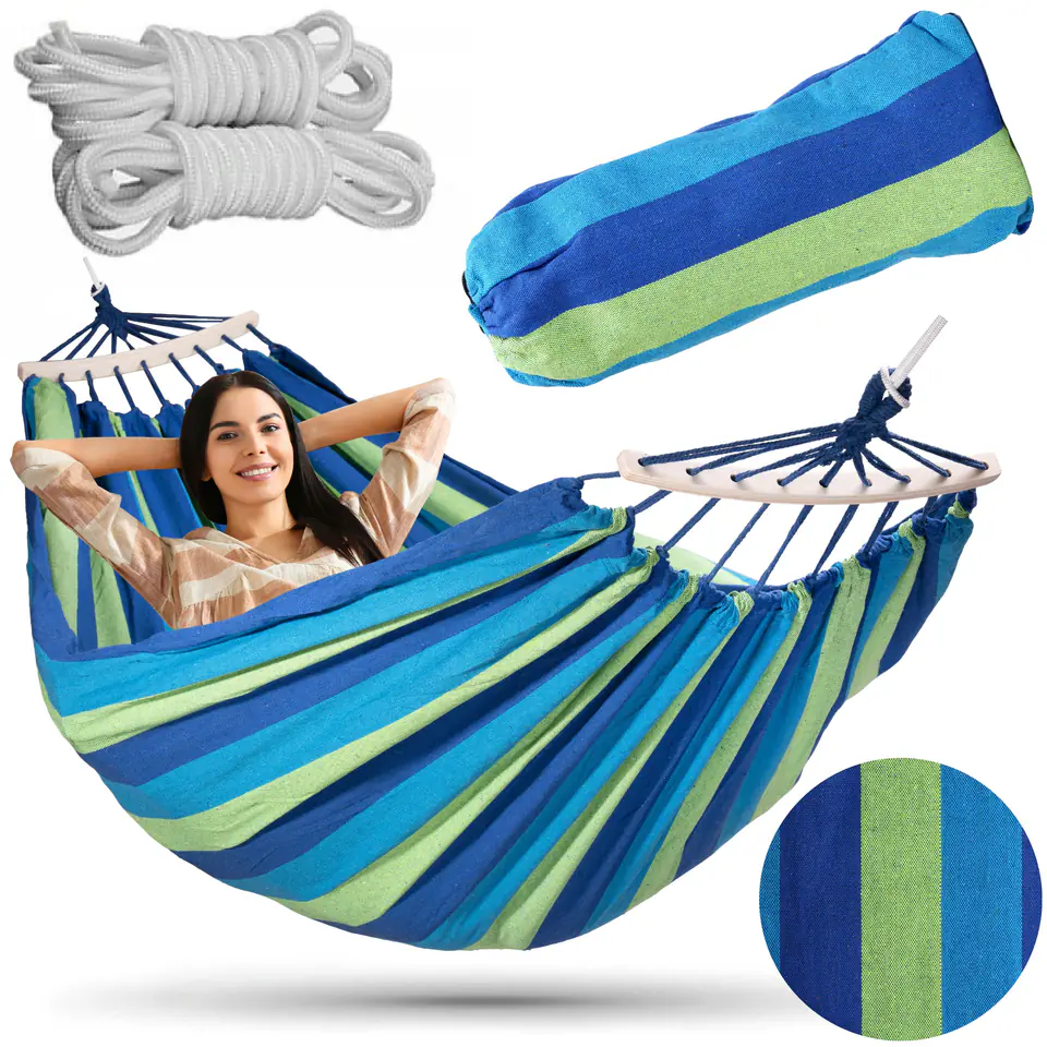 Hamak ogrodowy EDEN LAGOON w paskiModel: EDEN | Kolor: MARINE Niesamowity relaks w Twoim ogrodzie!Hamak ogrodowy Eden to idealne połączenie komfortu i trwałości, zaprojektowane dla dwóch osób. Dzięki maksymalnemu obciążeniu do 200 kg, solidnej konstrukcji oraz linkom z drążkami stabilizującymi, zapewnia stabilność i bezpieczeństwo użytkowania. W zestawie znajdują się linki do przywiązania i pokrowiec, co umożliwia łatwe montowanie i przechowywanie. Materiał wykonania to wytrzymałe połączenie 65% bawełny i 35% poliestru, zapewniające komfort, a drewniane drążki stabilizujące dodają estetyki oraz równomiernie rozkładają ciężar, zwiększając komfort użytkowania. Hamak Eden jest doskonałym wyborem dla każdego, kto ceni sobie relaks na świeżym powietrzu w otoczeniu natury. ☀️ Cechy produktu:✅ Duży rozmiar dwuosobowy: Hamak Eden oferuje przestronne miejsce do wspólnego relaksu dla dwóch osób.✅ Maksymalne obciążenie do 200 kg: Solidna konstrukcja hamaka zapewnia bezpieczeństwo i wytrzymałość, umożliwiając wspólny wypoczynek bez obaw.✅ Linki z drążkami stabilizującymi: Drążki stabilizujące zapobiegają zaplątaniu się linek i zwiększają stabilność konstrukcji, co przekłada się na wygodę użytkowania.✅ Zestaw zawiera linki do przywiązania oraz pokrowiec: Ułatwia montaż w wybranym miejscu oraz przechowywanie i transport hamaka, zapewniając jego długotrwałe użytkowanie.✅ Materiał wykonania: 65% bawełna i 35% poliester: Wytrzymała mieszanka materiałów łączy komfort bawełny z odpornością poliestru.✅ Drewniane drążki stabilizujące: Nie tylko zwiększają estetykę hamaka, ale także rozkładają ciężar równomiernie, co zwiększa komfort leżenia. Wymiary produktuDługość całkowita: 260 cmDługość materiału: 200 cmSzerokość materiału: 150 cmPałąk drewniany: 40 cm Informacje dodatkowePrzedstawione kolory należy traktować poglądowo - mogą odbiegać od rzeczywistych ze względu na różne ustawienia monitorów oraz proces obróbki zdjęć. Rzeczywiste wymiary mogą się różnić od podanych wyżej. Tolerancja błędów może wynosić +/- 5%. Marka:eHokeryKod produktu:063325MGKod EAN:5905523063325Kolor:blue lagoonSzerokość materiału: 150 cmDługość materiału:200 cmMateriał:bawełna + poliesterMaksymalne obciążenie:200 kgPrzeznaczenie:ogród | plaża | działka | taras | balkon | kempingDrążki stabilizujące w zestawie:tak
