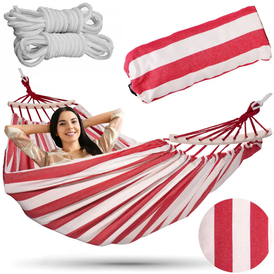 Hamak ogrodowy EDEN PANNA COTTA w paskiModel: EDEN | Kolor: PANNA COTTA Niesamowity relaks w Twoim ogrodzie!Hamak ogrodowy Eden to idealne połączenie komfortu i trwałości, zaprojektowane dla dwóch osób. Dzięki maksymalnemu obciążeniu do 200 kg, solidnej konstrukcji oraz linkom z drążkami stabilizującymi, zapewnia stabilność i bezpieczeństwo użytkowania. W zestawie znajdują się linki do przywiązania i pokrowiec, co umożliwia łatwe montowanie i przechowywanie. Materiał wykonania to wytrzymałe połączenie 65% bawełny i 35% poliestru, zapewniające komfort, a drewniane drążki stabilizujące dodają estetyki oraz równomiernie rozkładają ciężar, zwiększając komfort użytkowania. Hamak Eden jest doskonałym wyborem dla każdego, kto ceni sobie relaks na świeżym powietrzu w otoczeniu natury. ☀️ Cechy produktu:✅ Duży rozmiar dwuosobowy: Hamak Eden oferuje przestronne miejsce do wspólnego relaksu dla dwóch osób.✅ Maksymalne obciążenie do 200 kg: Solidna konstrukcja hamaka zapewnia bezpieczeństwo i wytrzymałość, umożliwiając wspólny wypoczynek bez obaw.✅ Linki z drążkami stabilizującymi: Drążki stabilizujące zapobiegają zaplątaniu się linek i zwiększają stabilność konstrukcji, co przekłada się na wygodę użytkowania.✅ Zestaw zawiera linki do przywiązania oraz pokrowiec: Ułatwia montaż w wybranym miejscu oraz przechowywanie i transport hamaka, zapewniając jego długotrwałe użytkowanie.✅ Materiał wykonania: 65% bawełna i 35% poliester: Wytrzymała mieszanka materiałów łączy komfort bawełny z odpornością poliestru.✅ Drewniane drążki stabilizujące: Nie tylko zwiększają estetykę hamaka, ale także rozkładają ciężar równomiernie, co zwiększa komfort leżenia. Wymiary produktuDługość całkowita: 260 cmDługość materiału: 200 cmSzerokość materiału: 150 cmPałąk drewniany: 40 cm Informacje dodatkowePrzedstawione kolory należy traktować poglądowo - mogą odbiegać od rzeczywistych ze względu na różne ustawienia monitorów oraz proces obróbki zdjęć. Rzeczywiste wymiary mogą się różnić od podanych wyżej. Tolerancja błędów może wynosić +/- 5%. Marka:eHokeryKod produktu:063332MGKod EAN:5905523063332Kolor:panna cottaSzerokość materiału: 150 cmDługość materiału:200 cmMateriał:bawełna + poliesterMaksymalne obciążenie:200 kgPrzeznaczenie:ogród | plaża | działka | taras | balkon | kempingDrążki stabilizujące w zestawie:tak